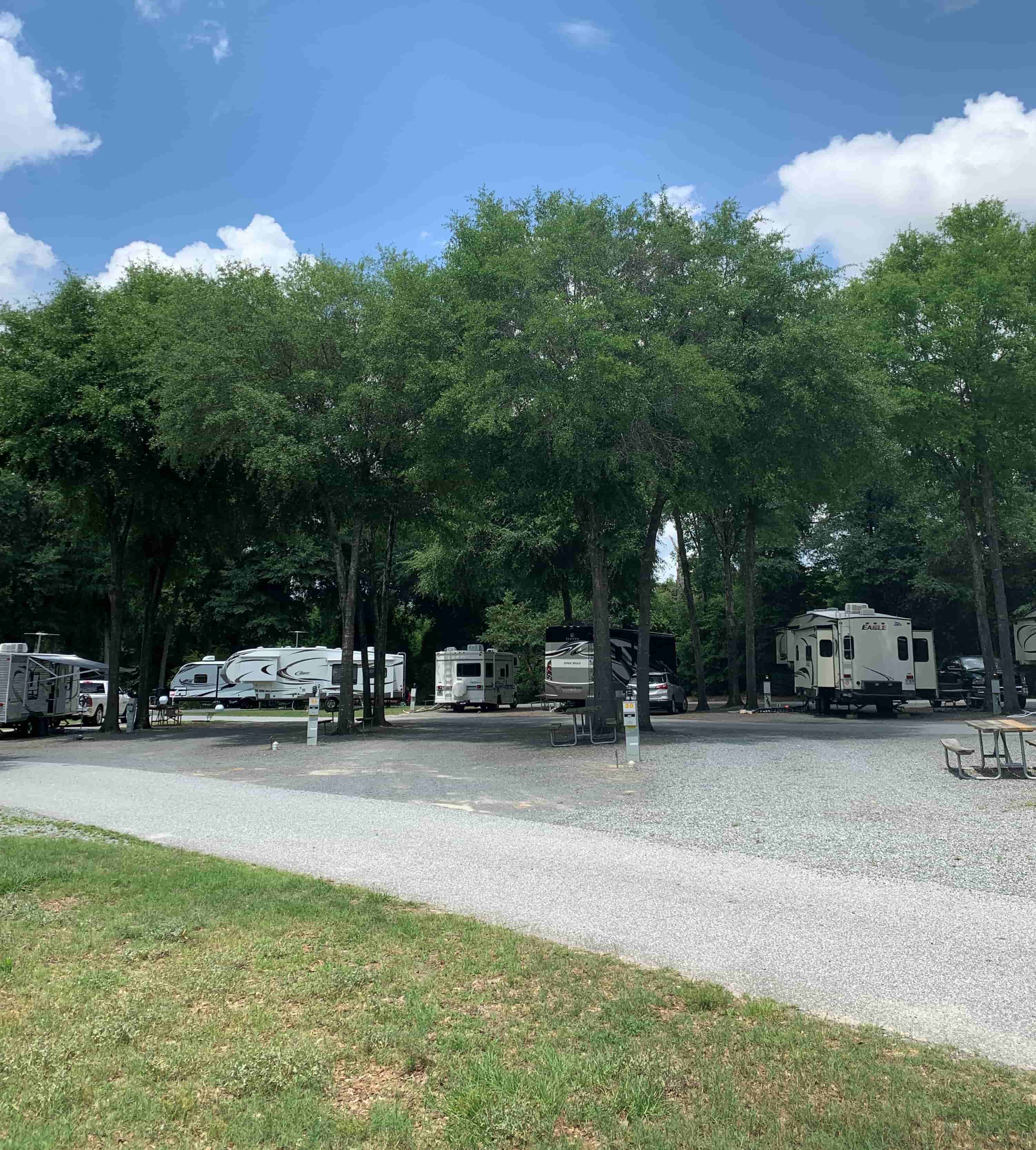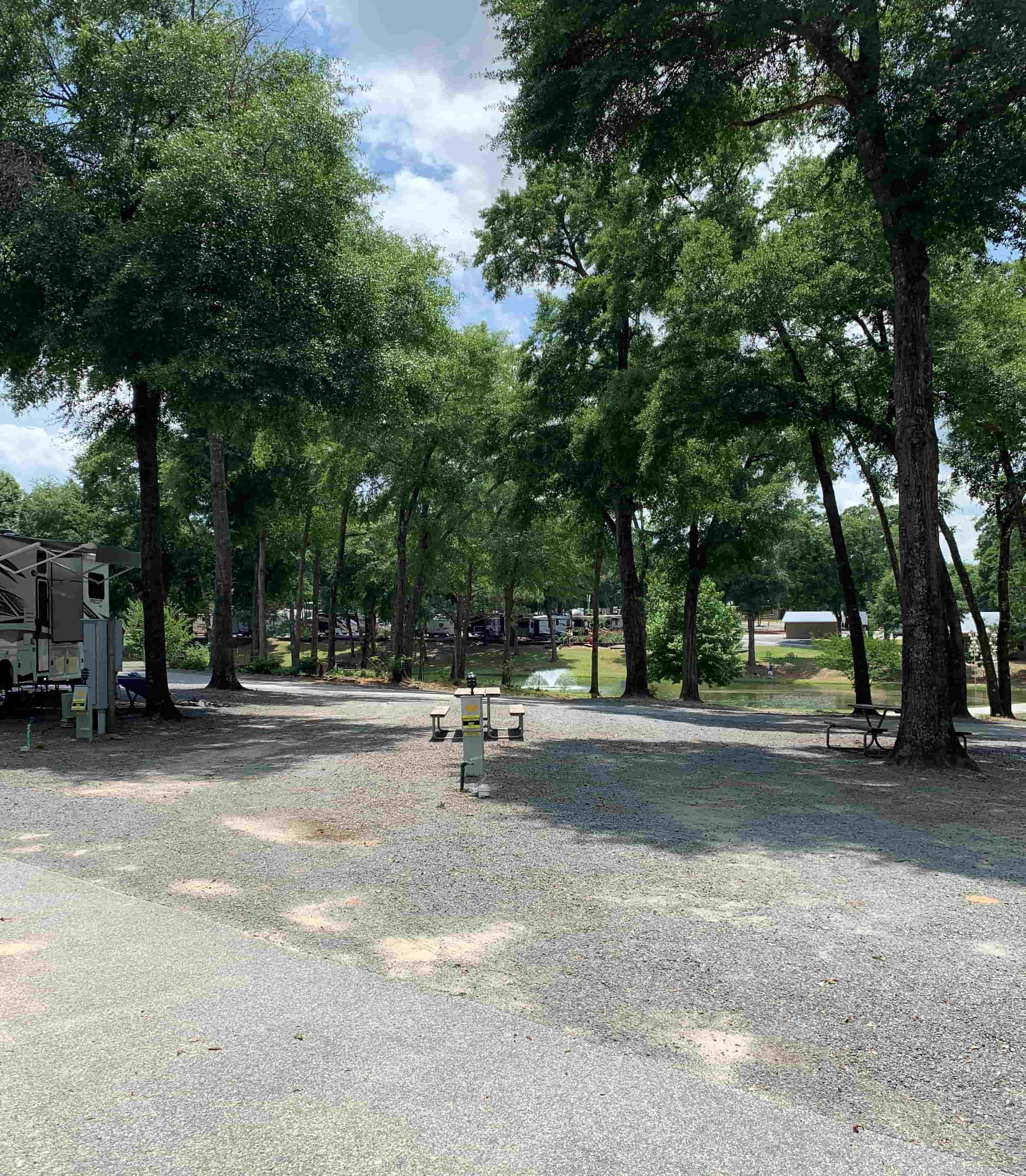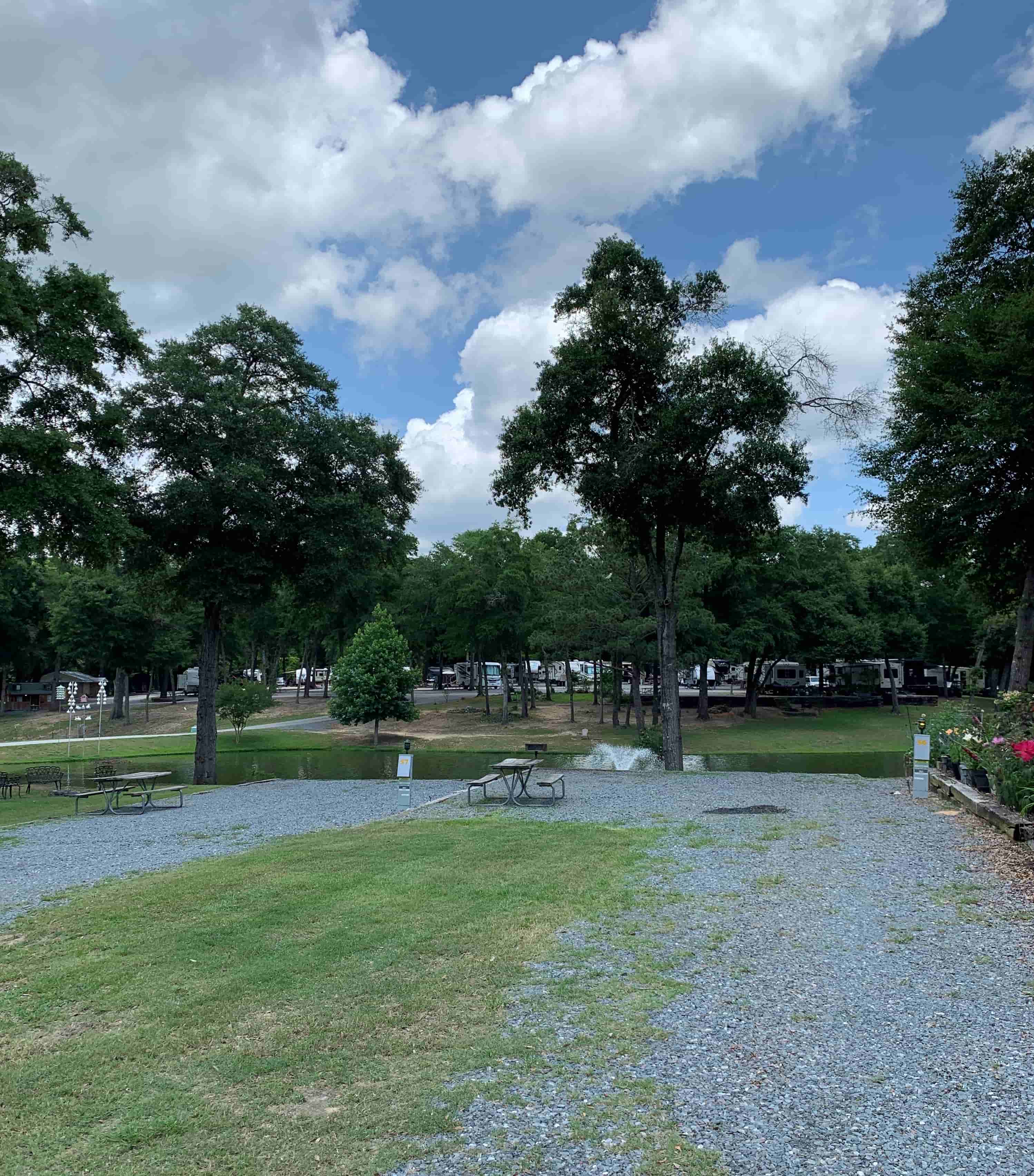 Each pull through, full hookup site includes city water, sewage, 50/30amp electricity, and excellent WiFi.  These spacious sites have a large 16' x 65' gravel pad along with a fire pit and picnic table.  Pond for fishing, biking/ hiking trails, and playground.  Laundry and bath house facility with 4 private bathrooms.