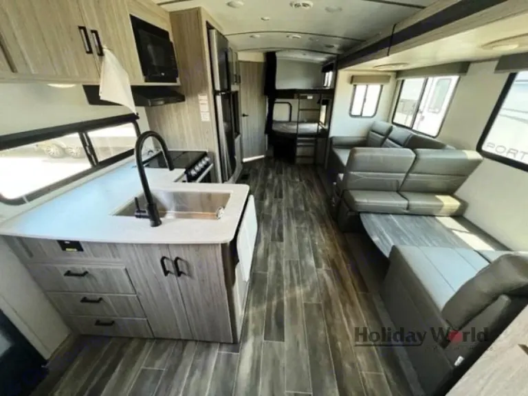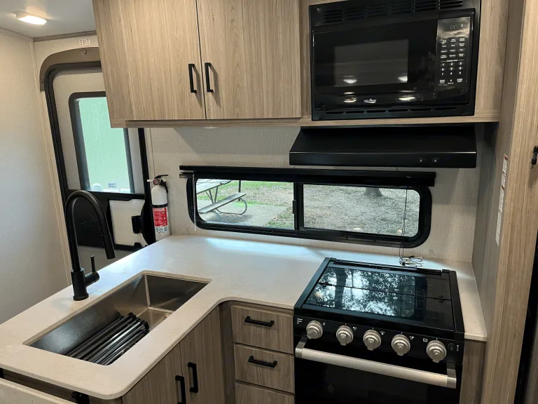 Enjoy luxury features you won't find on other trailers including solar panels, 2 AC Units, Bluetooth outdoor speakers, an outdoor kitchen, 21 ft power awning, and fully electric jacks and hookups.This trailer can sleep 8-10 people comfortably, so bring the whole family and a few friends. The master bedroom has a queen with a privacy door to allow for some quiet time. The rest of the family has access to double bunk beds and a full sized bed/couch found in the rear of the camper. If you're looking for some extra sleeping options, the dinette area can also be configured to make room for two more guests to sleep.The kitchen includes a large fridge, large sink, stovetop, oven, and microwave and can be the perfect place to cook some amazing meals for the family. There's also a full outdoor stovetop burner with mini fridge to keep your drinks cold while you cook.Ce qui est inclusOur goal is to make sure that your trip is as smooth and as stress free as possible so we've include the following items to make your trip easier on you:Kitchen Supplies: