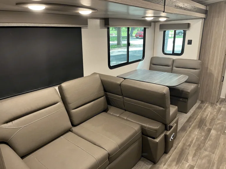 Enjoy premium outdoor living with a power awning, Bluetooth speakers, and full outdoor kitchen.