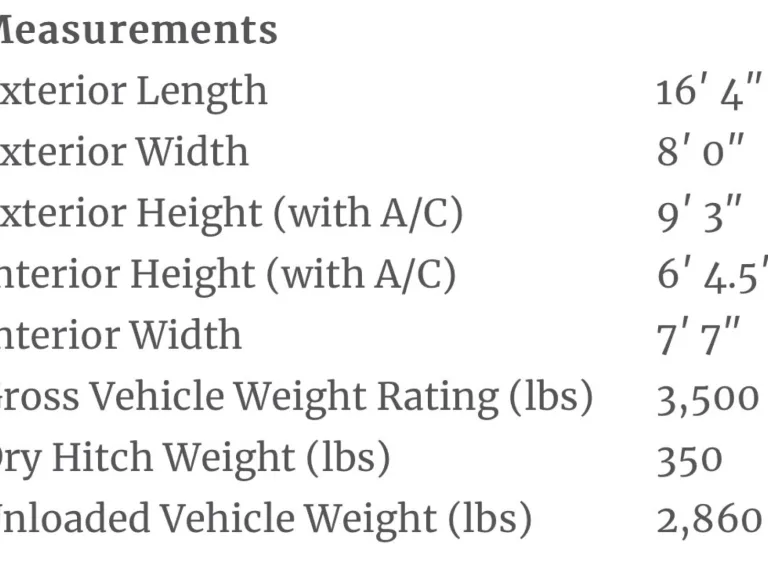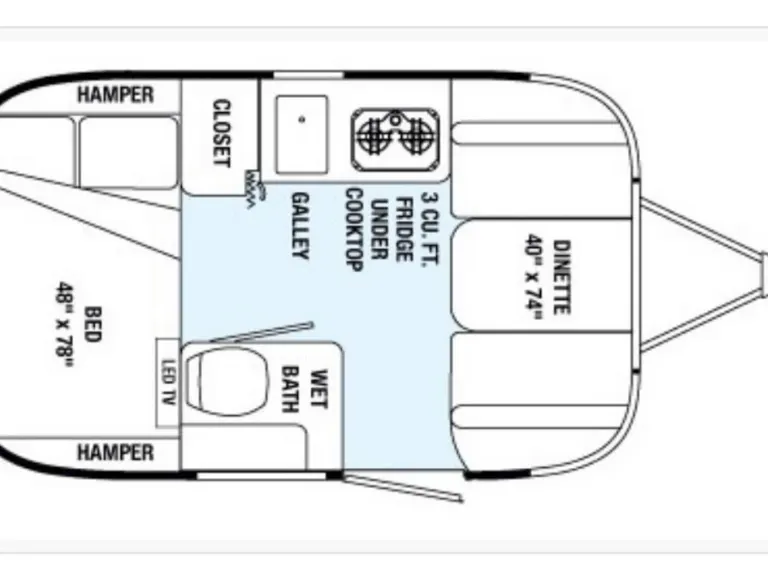 She's tiny! But she's mighty :) At 16ft long and only 2800lbs, she can be towed by most SUVs and comes equipped with everything needed for comfort and connivence, including: bathroom, shower, refrigerator, stove, AC, heater, awning, full sized bed, dining table that converts into additional full sized bed, cable ready TV and DVD player, and more. There is plenty of storage including a closet, several upper cabinets, kitchen cabinets, under-bed storage, etc.