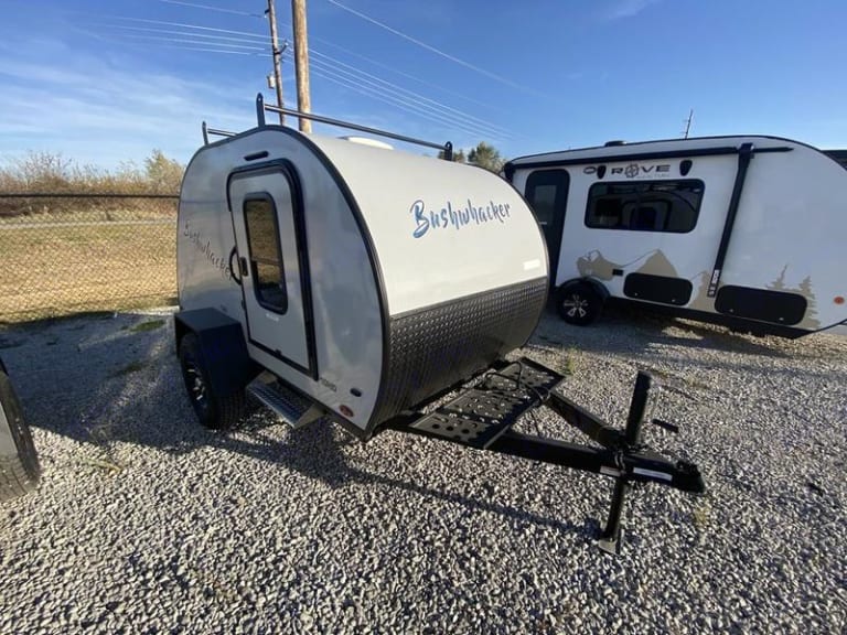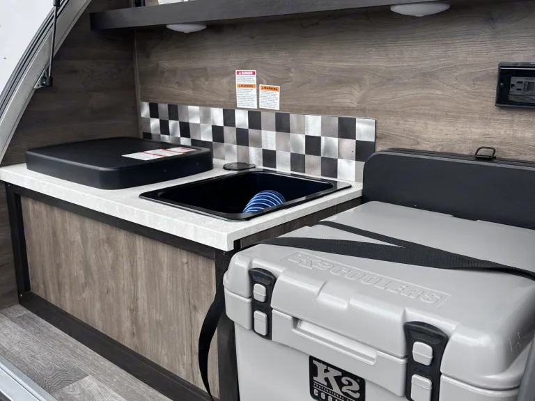 The Bushwhacker 10HD is a compact, lightweight, and easy tow camper. The trailer comes equipped with a 5,000 BTU wall mounted air conditioner, Bluetooth compatible stereo with interior speakers, 12V – 3 Speed Vortex Roof Fan, roof mounted gear rack with a 300 lb. weight capacity great for bikes or kayaks, exterior kitchenette with a 2-burner gas cooktop, built-in sink, and a K2 Summit Series Cooler. The camper has several 12V, 110V and USB outlets conveniently located throughout to keep you connected while out exploring. There is 24-gallons of fresh water available for use for the sink. This will come filled for your convenience. Power hookups or the generator are required for the operation of the water (water pump), heater, and air conditioner.