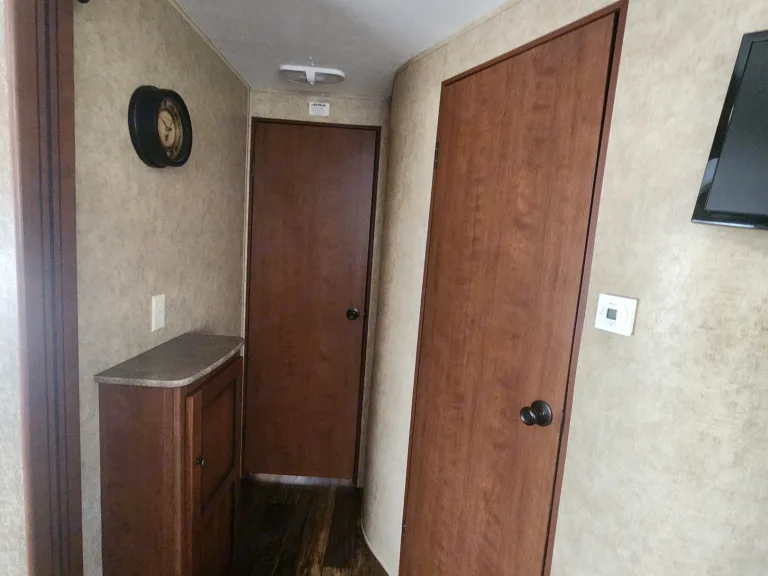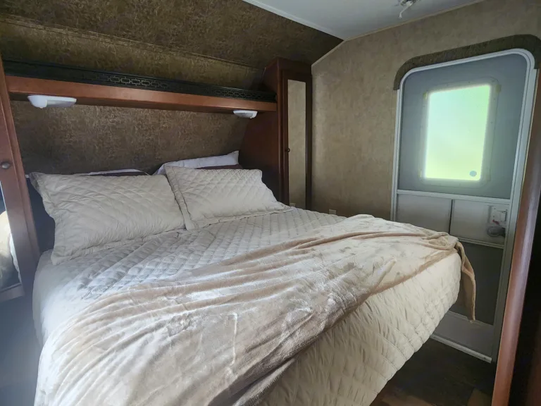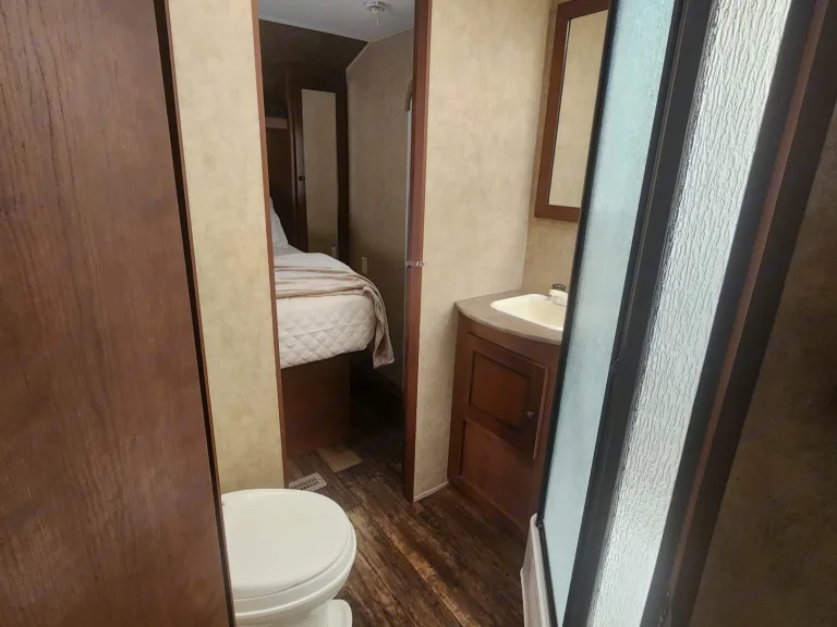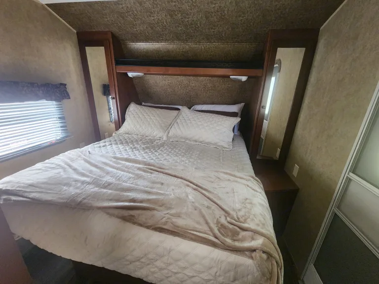 Fully stocked – just bring your clothes, food, and sense of adventure!Inside you’ll find:Private front king bedroom with two closetsLarge slide-out with convertible dinette + sleeper sofaRear kitchen with oven, microwave, double sink, and extra counter spaceFull bathroom with corner shower and skylightDucted A/C and heatTV, DVD player, and indoor/outdoor sound systemLots of storage throughout!Outside features:Electric awning for shade and chill timePass-through storage for extra adventure gearOptional generator add-on (Towable rentals)Available for delivery to campsites, events, or private property
