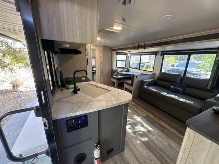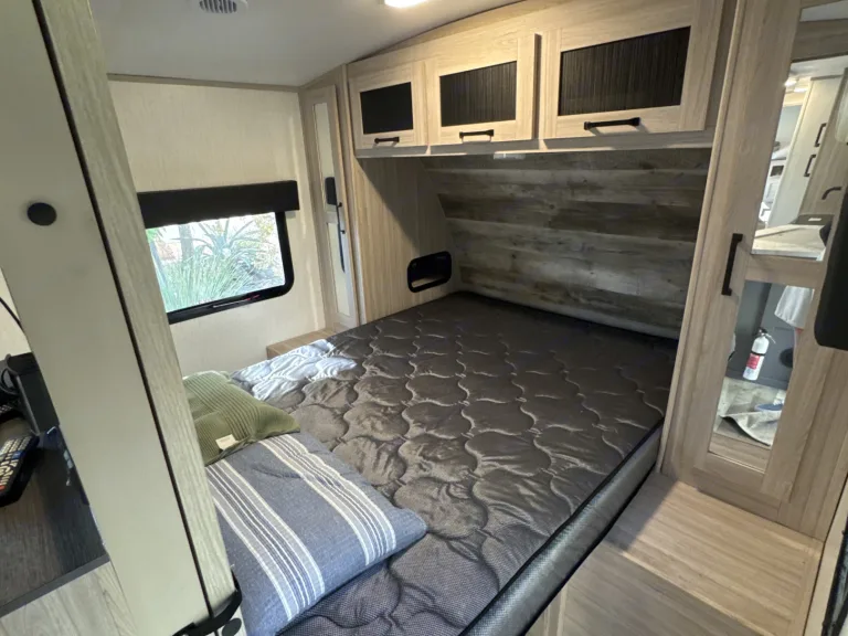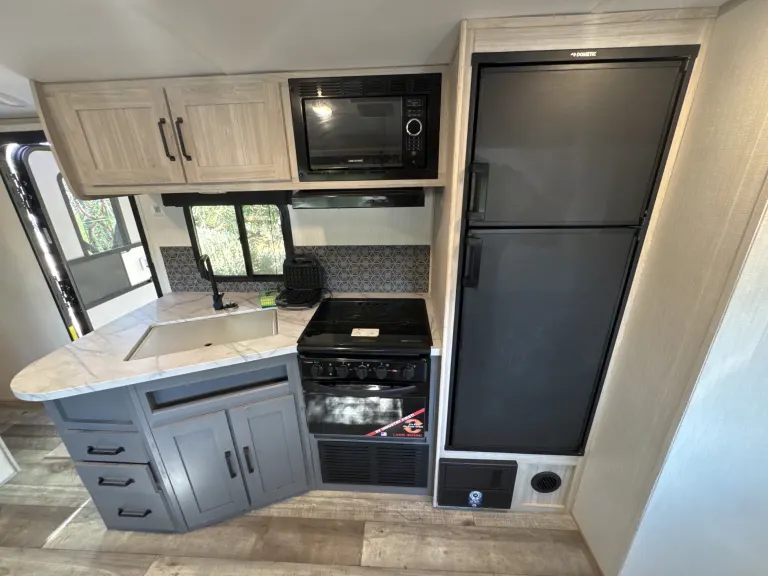 With comfy bunks for the kiddos, a cozy queen bed for the grown-ups, and a dining booth that pulls double duty as a sleeping spot, there’s a place for everyone—even the family pet who insists on sleeping in the middle.Kitchen = Snack Central