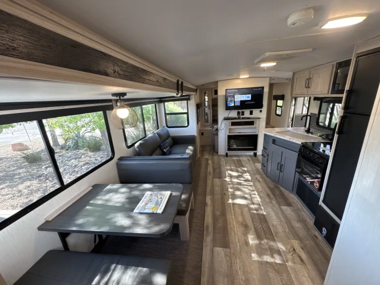 After a day of hiking, biking, or just poking sticks into a campfire, kick back in a space that’s perfect for cards, crafts, or collapsing in a happy heap. The dinette and couch are just the right mix of comfy and lived-in, like a warm hug after a long day.Yes, It Has a Bathroom (And It’s Not Scary)