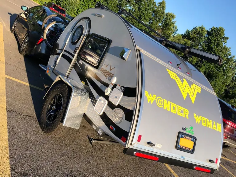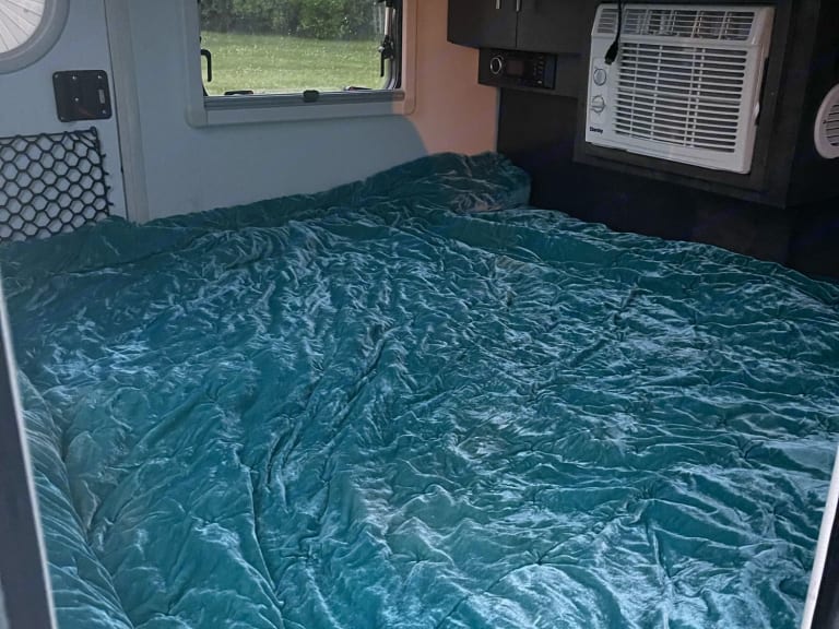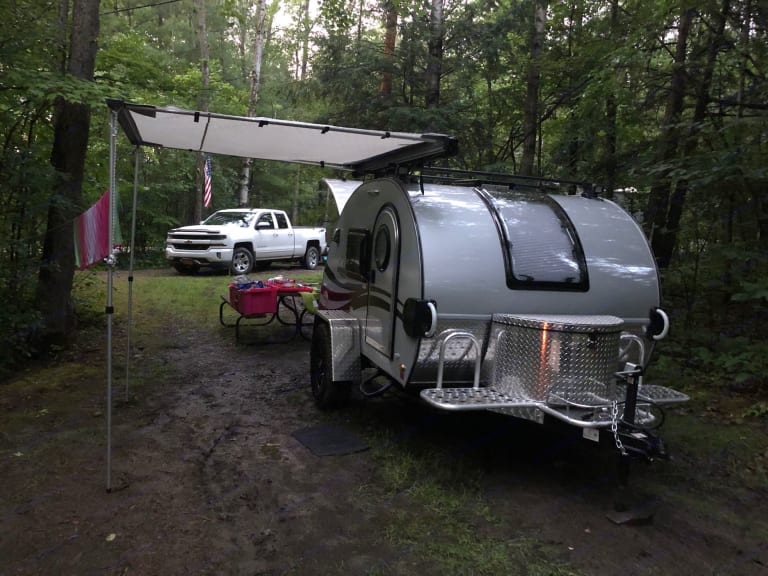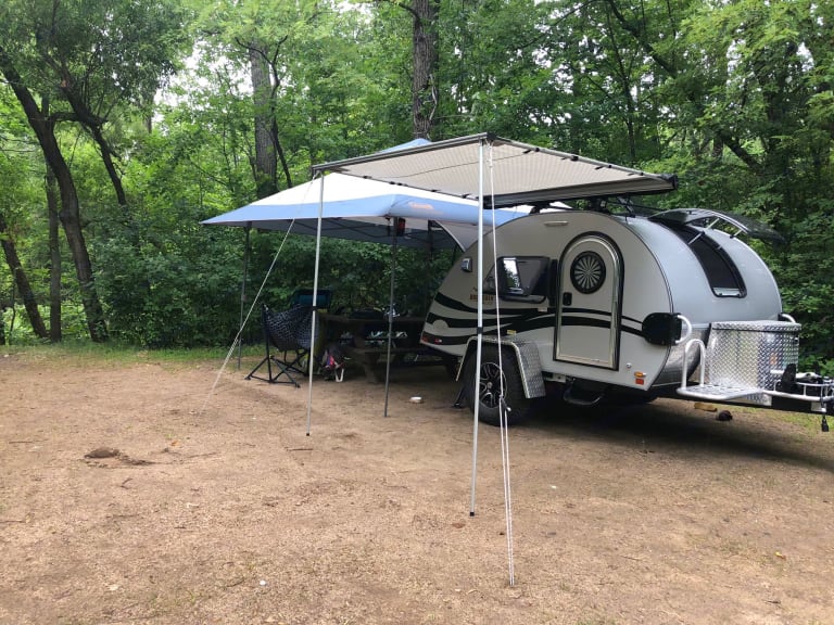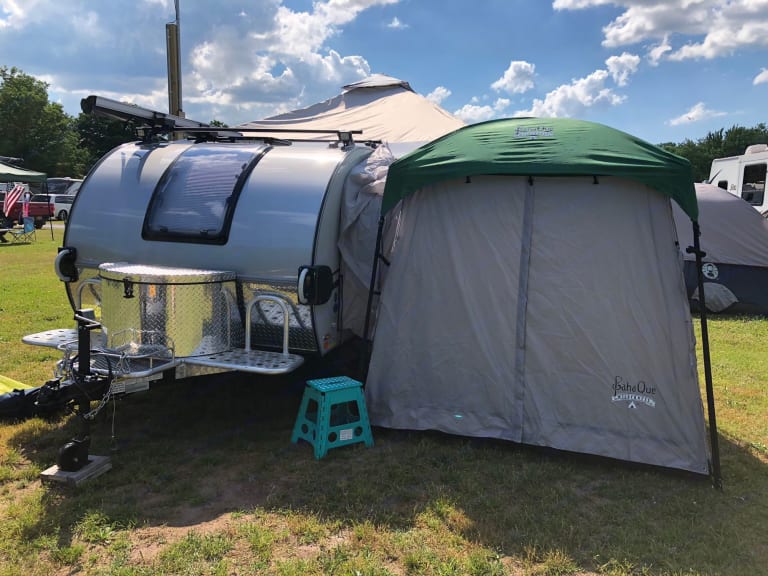 Anyone can tow this teardrop travel trailer! At only about 1400 lbs dry weight, even sedans can tow this and have an outdoorsy adventure! This camper is 13’ long and 7’9” wide. This is the perfect RV for those looking for an easy camping trip without needing to pack up everything and set up tents when you arrive to your destination. Just hook up and go on your way! Inside this teardrop there’s a king sized bed, stargazer window, ceiling fan, lots of storage, air conditioner, plug in space heater, television, and entertainment system with CD/DVD player and Bluetooth capability. There are three zones of speakers to allow your music both inside and out. Outside on the back is an outdoor kitchen, equipped with a microwave, two burner propane stove, sink, and Yeti cooler. Kitchen essentials come stocked in the camper to give you everything you’ll need on your trip. There is a storage bin on the front with a propane tank and battery to allow for boondocking. Electrical hook up is required for standard outlets, microwave, and air conditioner usage. There is an outdoor shower available for use on the go. If desired, you can also rent attachable 5’x7’ tents to expand your space. These are able to be installed in minutes by one person and attach right to either door of the camper. The walls are all screens with roll up privacy walls. Additionally, you can also rent the outdoor canopy, perfect to give shelter over the outdoor kitchen and eating area.Ce qui est inclusIncluded is the trailer, one side awning, kitchen accessories, and everything needed for water and electric hook up. Accommodates 6 guests if using the side tents.RecommandationsThis camper is rugged enough to go anywhere your adventure takes you and small enough to fit in most standard tent camp sites.Autres points à signalerNo smoking allowed inside camper. Well behaved pets are allowed.