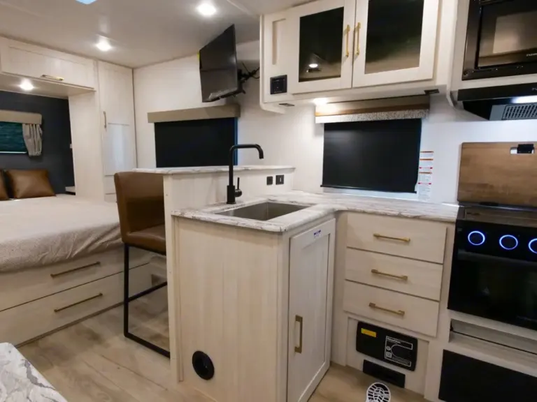 Forest River is known for producing high-quality trailers.This is a very modern style trailer, with light interior, and comes with everything you need for your trip.Sleeps up to 4. Half-ton towable at just over 5,000 LBS dry weight. You’ll have plenty of space for short and long trips with 25 feet of trailer. This coach has a “modern” look and feel, with the light colors to go with the brown trim.