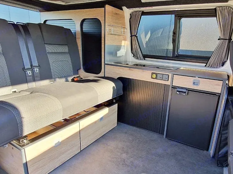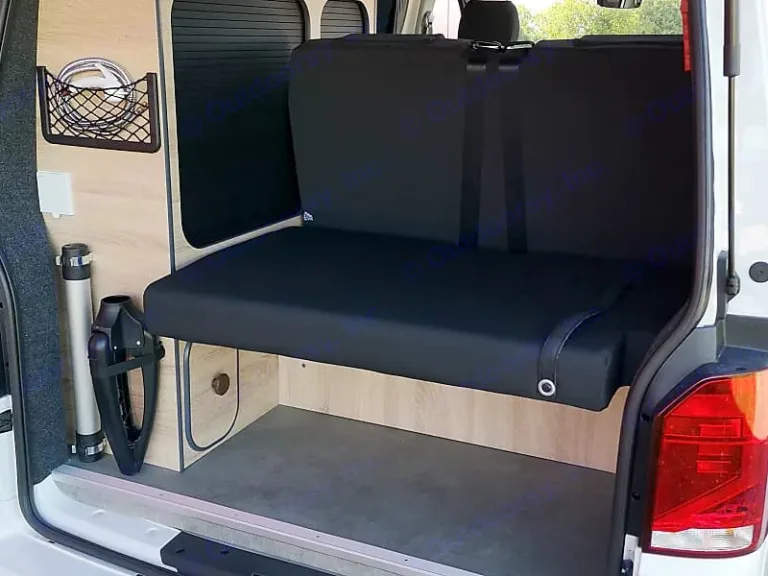 CG Vasp 5 places (Banquette double AV, rabattable en 2 secondes, qui permet d’asseoir 2 personnes côté aménagement, avec un grand coffre de rangement intégré).