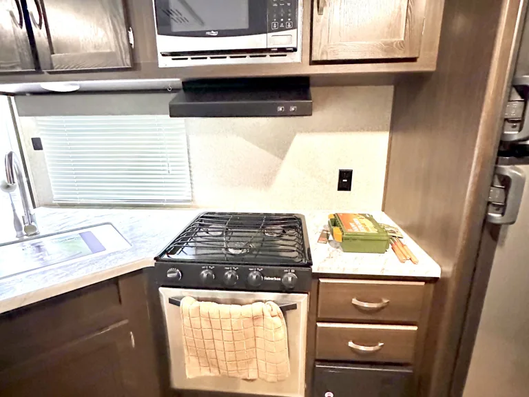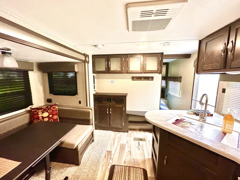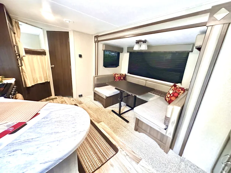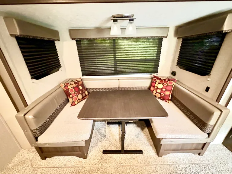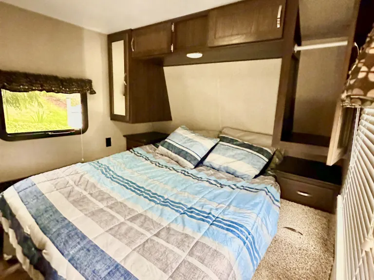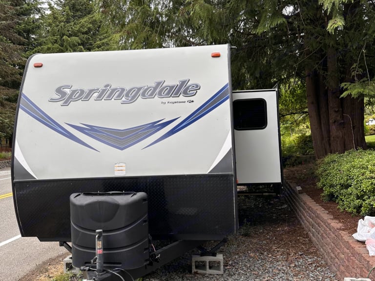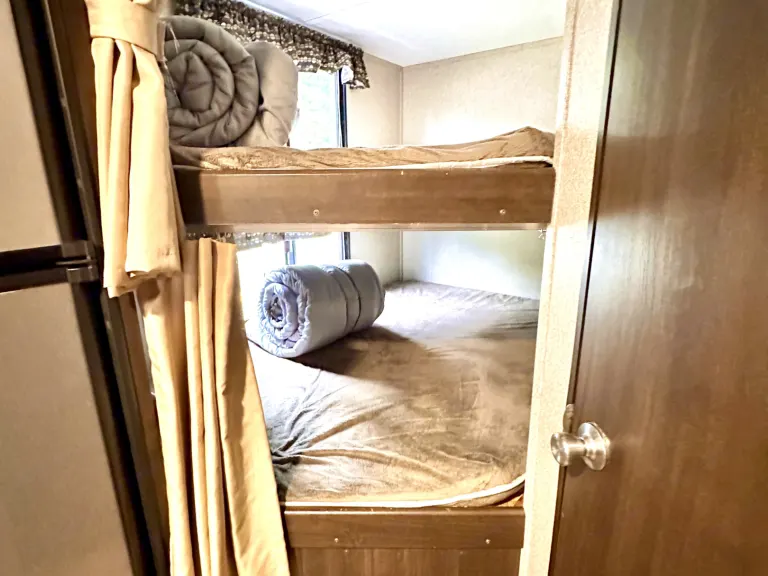 Introducing Atlas, the Travel Trailer, this 2018 Keystone Springbrook 28’ travel trailer! This trailer features a short queen bed with 4” gel memory foam mattress topper, sliding door for privacy, the bunk beds also have a 2” mattress topper, 3 burner induction stove, small oven, microwave, refrigerator, AC, and heater! Atlas is also equipped with Bluetooth stereo interior and exterior speakers, TV (although, who wants tv when you’re outdoors)!
