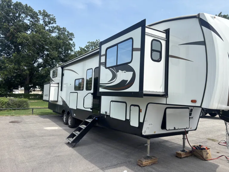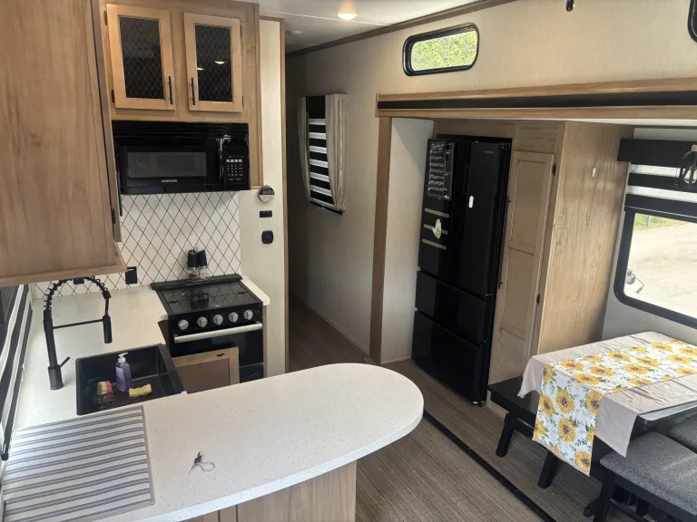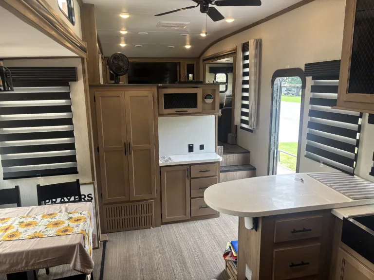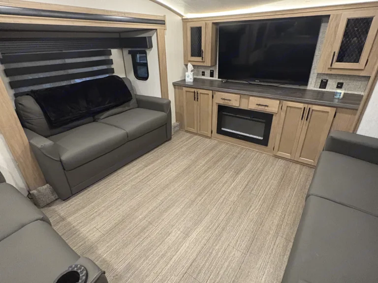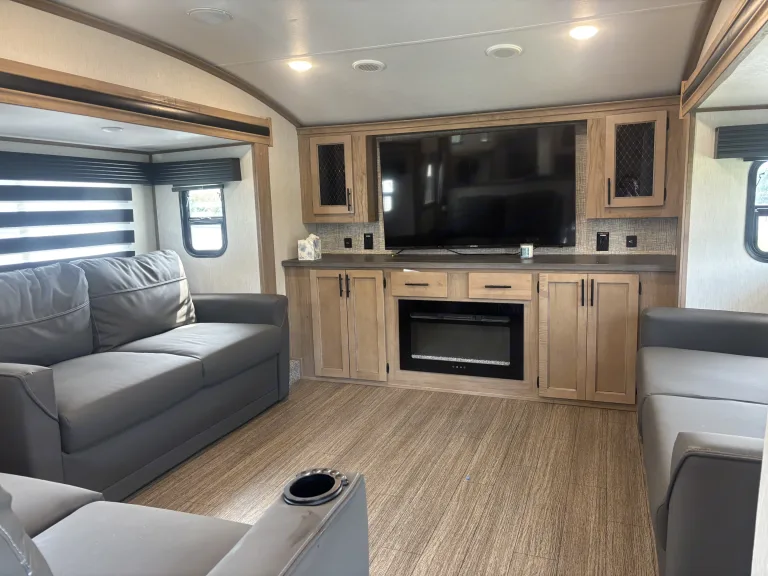 Experience luxury on the road in this beautifully designed 5th wheel RV. Step into a spacious living room featuring an electric fireplace, perfect for cozy evenings and relaxing after a day of adventure. The full kitchen comes equipped with a large refrigerator, counter space, and everything you need to prepare meals. Enjoy dining or game nights at the comfortable table seating area.Rest easy in the private bedroom with a king-size bed, while extra sleeping space is available in the loft and pull out couches, making it ideal for families or guests. There is enough bedding for every bed. Whether you're exploring the great outdoors or hanging by the fire, this 5th wheel RV combines comfort, style, and functionality for the ultimate camping experience.Ce qui est inclus• Bedding for all beds, including jackknife couches