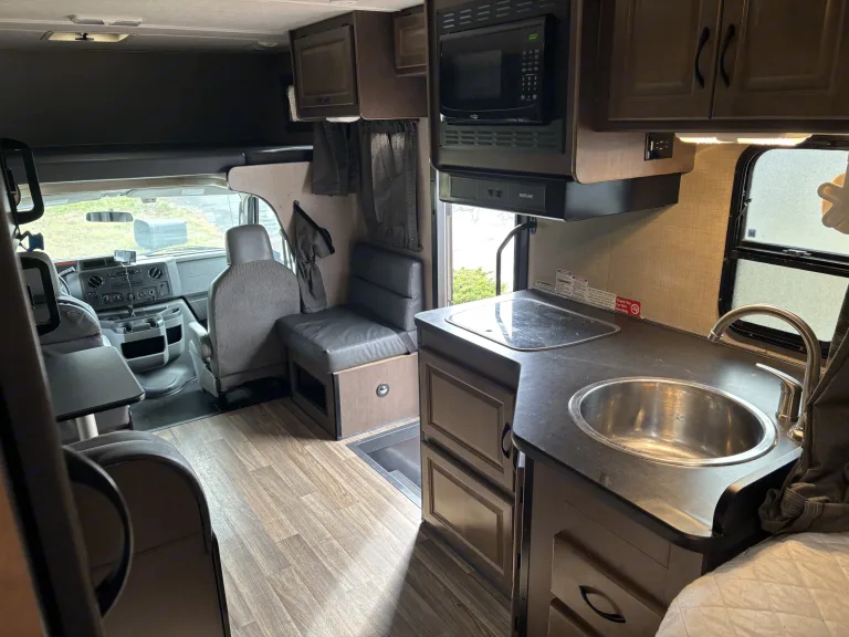 RV Type: Class C MotorhomeLength: 25 feet (23' floor plan with front cab)Chassis: Ford E-350Engine: 6.8L Triton V10 GasolineTransmission: AutomaticFuel Capacity: 55 gallons (gasoline)Drive Type: Rear-wheel driveSeat Belts: 5Sleeps: Up to 5Queen bed (rear)Over-cab bunkConvertible dinetteSlide-Outs: None (simpler setup and fewer moving parts)Tank Capacities