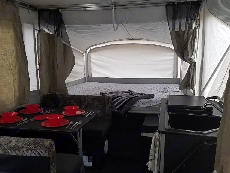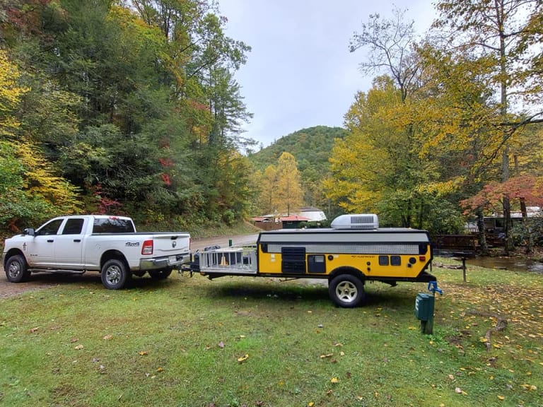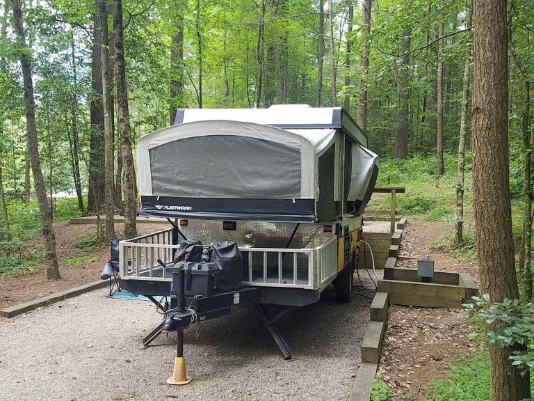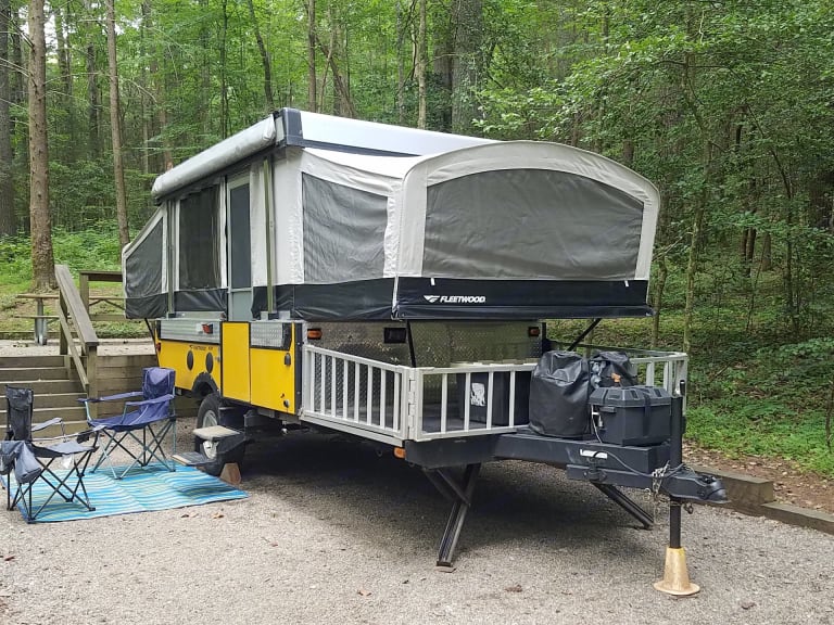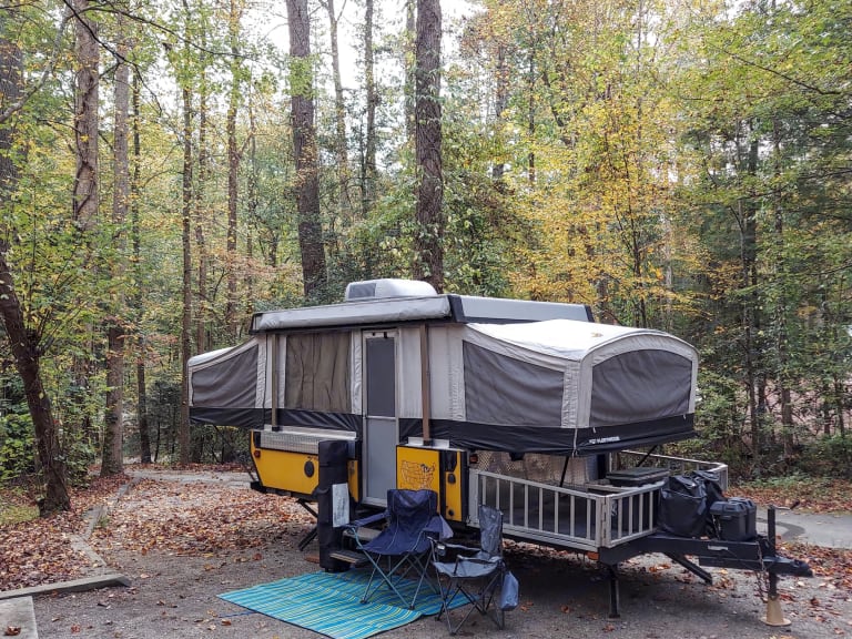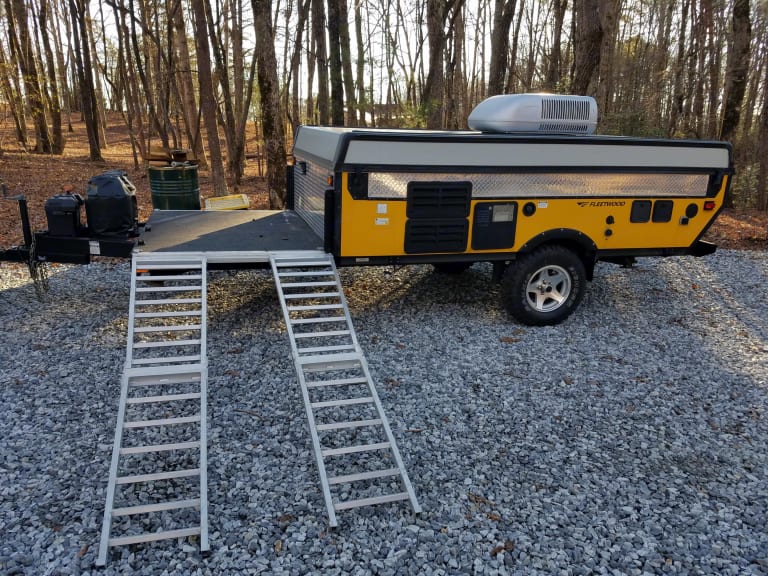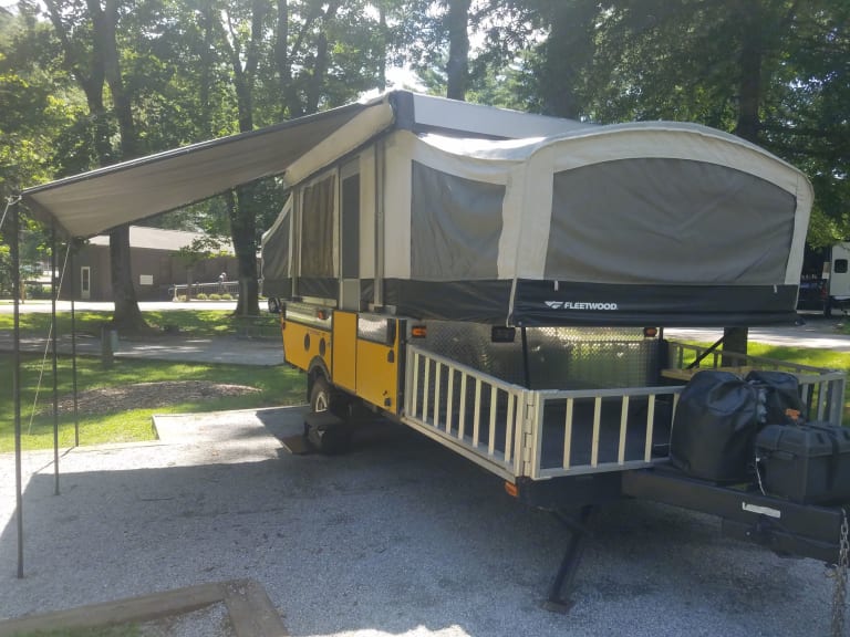 Welcome to Little Yeller Feller. This mighty little popup has room for the family, and an area to haul your toys along on your trip. You can also haul your grill, gear, or what ever you may need. The deck is 50" by 80", so there is room for motorcycles, a four wheeler, or your golf cart. This popup will sleep 6, it has full bed on one end, and queen bed on the other end. The dinette makes into a full bed. It has a small kitchen, with 2 burner stove, sink, and fridge. Cold roof A/C with electric is little thing even has a small bathroom in it. Out side shower/wash station. Plenty of storage on the inside also for all your camping items.Our campers are pet friendly, and come stocked with propane, outside gas grill, 4 place dinnerware sitting, extra disposable dinnerware, coffee pot, pots & pans, paper towels, toilet paper, trash bags, broom, clean sheets and blanket on beds, Set of 4 towels & wash cloths, can opener, grill lighters, bottle opener, and cooking/grilling utensils. 2 camping chairs, outside mat. This is all included with your rental. All you need is your clothes and favorite pillow, maybe a blanket, and food. Thanks for checking us out and God bless.Delivery available, check before booking due to work schedule. Near: Helen GA, Blairville Georgia, Cleveland Ga, Gainesville Ga, Dawsonville Ga, Cumming Ga, Lake Lanier. Chattahoochee National forest, Appalachian Trail, Appalachian Mountains.