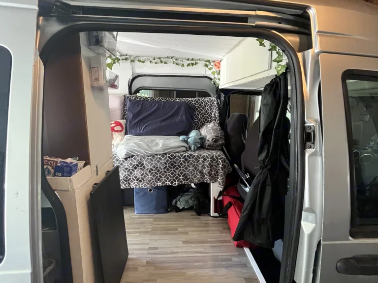 Quinn is a cozy 2013 Ford Transit Connect custom conversion. Featuring handmade countertop/cabinets, overhead storage, convertible bench to twin bed, sink, two-burner propane stove, and a ceiling fan for cooling and ventilation.This rig also features colorful LED lighting that can be synchronized to music, a 21QT refrigerator/freezer, and a solar powered portable power station with 11 different output ports for multiple different devices. Ce qui est inclus-Gel-memory foam cushions