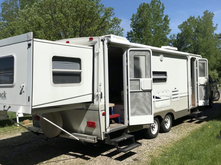 Check out this quaint, but roomy 2004 25RSS Outback travel trailer for your next camping adventure. Trailer in great condition, new tires, brakes lines, and recent inspection. The trailer has one pull out in the rear and an electric slide out on the drivers side with an awning. Sleeps up to 8 with master bed, couch and dining table that both fold down and two single bunk beds. Air and heat are both in excellent working condition as well as all appliances, including the attached outdoor grill area (great for end of day grilling!). Lots of storage both inside and out. 4650 lbs to pull, surprising light for the amount of space provided. Comes with a hitch with sway bars for easy use.