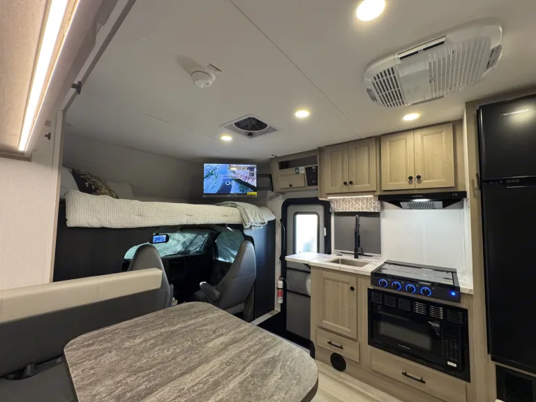 Built on the powerful Chevy 3500 chassis with a smooth automatic ride, this easy-to-drive Class C RV is ideal for families, couples, and first-time RVers. Whether you’re cruising the California coast, escaping to Big Bear, or exploring National Parks, you’ll feel right at home wherever you go.Inside, enjoy a spacious kitchen slide-out, private queen bed, full bathroom, and smart layout that comfortably sleeps up to 6 travelers. The modern kitchen includes a refrigerator, freezer, microwave, oven, and stovetop — plus all cookware, utensils, and dinnerware.This RV is packed with thoughtful touches: multiple power outlets and USB ports throughout (great for working remotely or charging devices), a smart TV, Bluetooth stereo, and cozy LED lighting inside and out.Fully stocked with linens, kitchenware, camping chairs, and outdoor gear — just bring your clothes, groceries, and your sense of adventure.Easy to drive and ready to roll — from shore to summit, this Sunseeker delivers the perfect getawayTop Features• Sleeps up to 6 comfortably – private rear queen bed, convertible dinette, and roomy cab-over bunk• Kitchen Slide-Out – expands your living area; includes fridge/freezer, 3-burner stove, convection oven / microwave, and sink• Private Bathroom – full shower, toilet, vanity, and storage with RV-friendly essentials provided• Tech-Ready Power Hub – tons of outlets and USB ports for phones, laptops, and devices throughout• Smart Entertainment – LED TV, Bluetooth stereo and optional portable speaker• Outdoor Experience – electric awning with LED lighting, outdoor mat, chairs, and optional grill setup• Easy to Drive – Chevy 6.6L engine, backup camera, automatic transmission, and smooth suspensionCe qui est inclus🏞️ Fully Stocked & Turnkey ReadyYour adventure starts the moment you arrive. We’ve included everything you need for a stress-free trip: