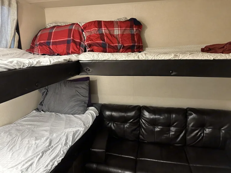 No smoking inside the camper—we want to keep the air fresh and clean for everyone!Whether you're planning a family vacation, a weekend escape, or a long road trip, our camper offers a fun and functional space to make lasting memories. Just pack your clothes, food, and sense of adventure—everything else is ready to go!Ce qui est inclusToilet paper & paper towelsPots, pans, and basic dishes10 bath towels and washclothsFour camping chairsBedding & pillows for the queen bed and three additional sleeping areasOptional bedding available for the dinette and two couches upon requestAttached gas grill – perfect for easy outdoor cookingOutdoor table for meals or lounging at your campsiteIce maker – great for keeping drinks cold on hot daysRoku TV in the living room + DVD playerTV & Blu-ray player in the kids’ room