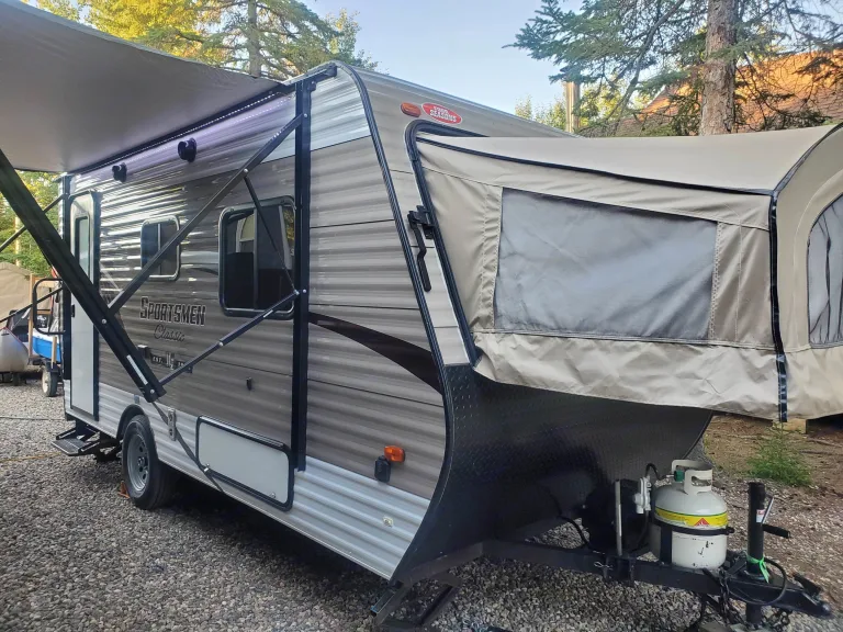 2019 Hybrid Travel Trailer for your weekend or vacation get aways. Lightweight, Only 2790 lbs dry weight, easy to tow with truck or suv. Trailer has fridge, stove, microwave, air conditioning and indoor shower. 2 Queen size fold out beds on each end and dining table flattens into a double bed. Electric awning with outdoor speakers and led lighting also provide a great outside area.Weight distribution hitch included with rental.Ce qui est inclusWeight distribution hitch, 220 to 110 volt adapter, 50 foot hose, water adapter with regulatorAutres points à signalerSorry no pets or smoking inside as we have kids with allergies.