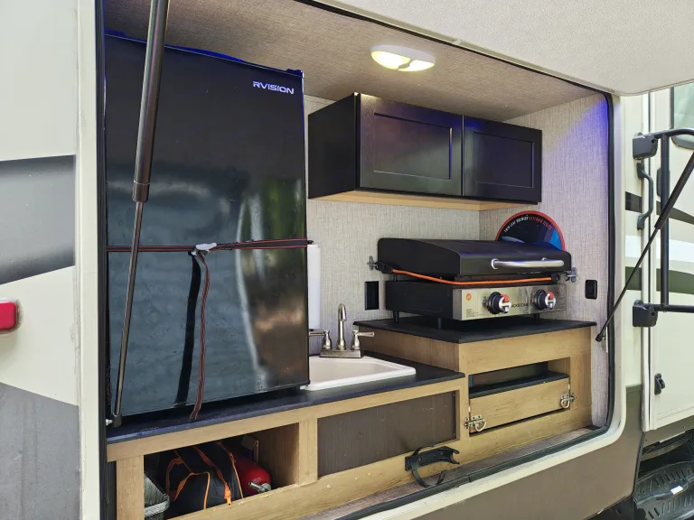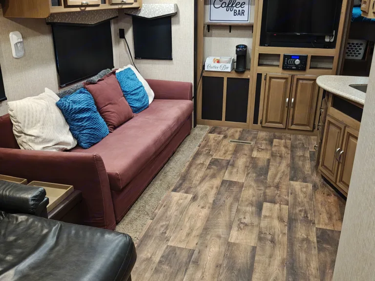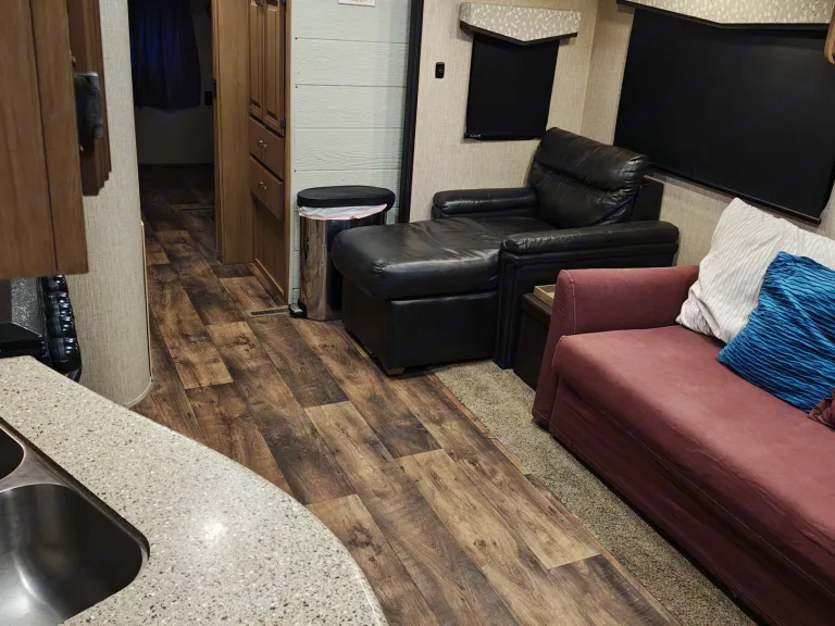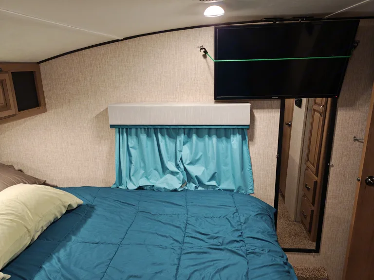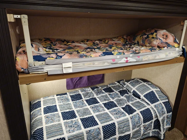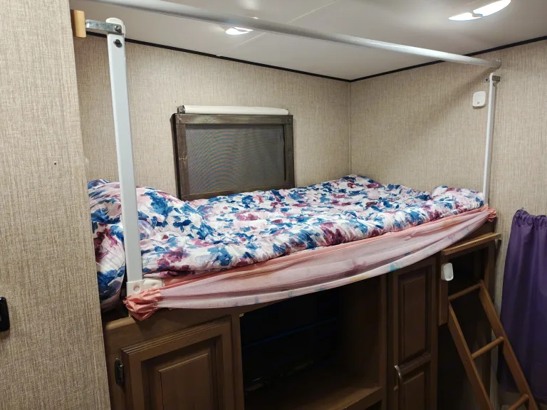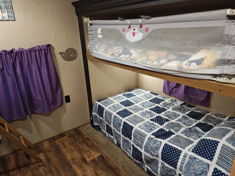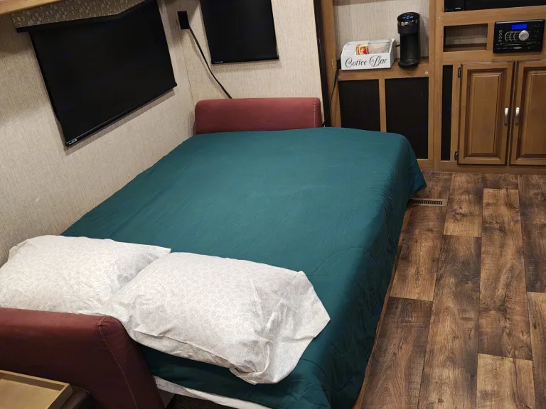 We’re excited to share our cozy but spacious fifth-wheel camper with you — your home away from home!Here’s what you can expect:Primary Bedroom: Enjoy a roomy king-sized bed in the private main bedroom, complete with a half bath and plenty of storage space for your clothes and personal items.Living Room: The comfortable couch easily converts into a queen-sized bed. You’ll find all bedding, along with a mattress pad and protector, conveniently stored inside the couch.Bunkhouse: Perfect for families! This area includes:One sturdy twin-sized bed rated for adult use.Two upper bunks, each with a 150 lb weight limit — ideal for kids.We’ve stocked the camper with essentials to make your stay as comfortable and enjoyable as possible. If you have any questions or need assistance during your stay, don’t hesitate to reach out.Welcome aboard — we hope you make wonderful memories here!Ce qui est inclus• TVs in primary bedroom, living room, and bunk house.
