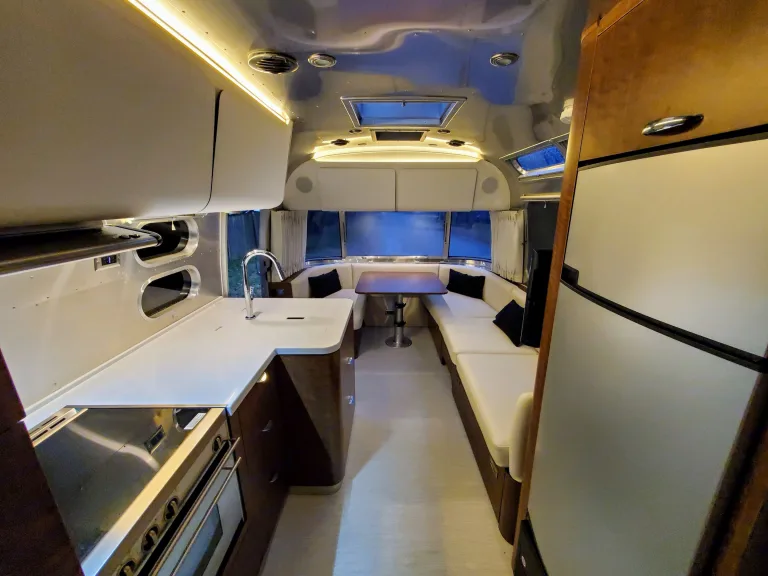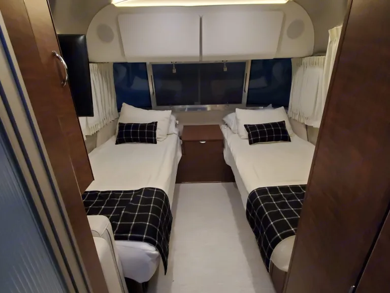 Experience luxury glamping in our 2019 Airstream Globetrotter, delivered and fully set up at your chosen campsite! This front bedroom twin model offers a spacious, modern interior that feels like a New York City apartment on wheels. It comfortably sleeps four adults or two adults and four children, making it perfect for family trips or group getaways.Equipped with all the comforts of home, including a full bathroom with hot water and a shower, a fully functional kitchen, air conditioning, and two televisions, you’ll have everything you need for a relaxing stay. Enjoy music or podcasts with the built-in radio and Bluetooth, and unwind in style.Skip the hassle of setup — we handle everything so you can simply arrive and start enjoying your adventure. Book your unforgettable Airstream experience today!