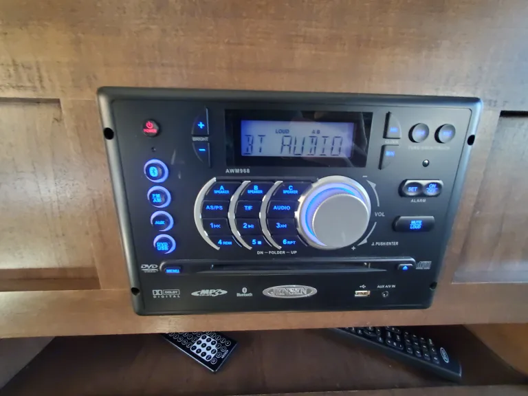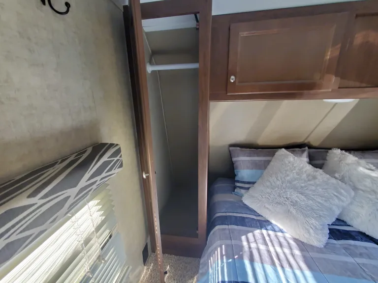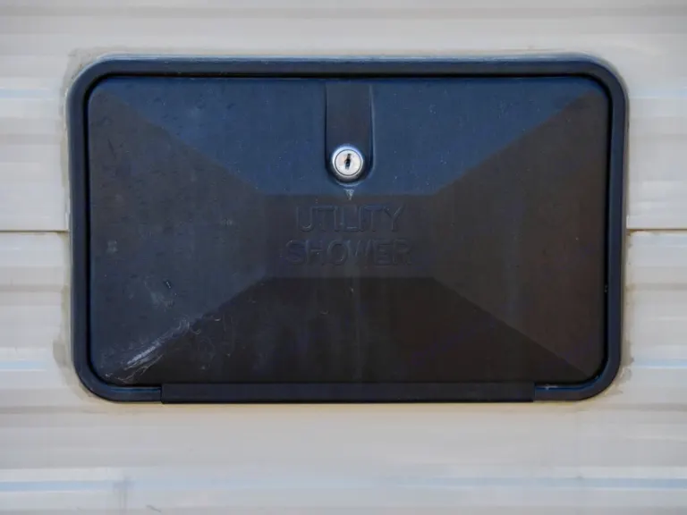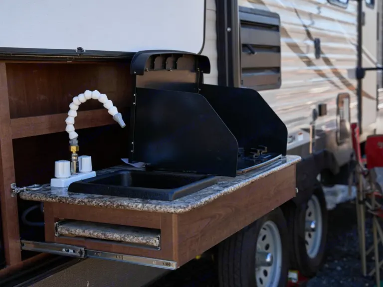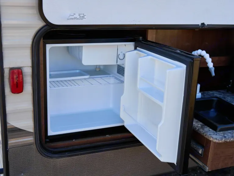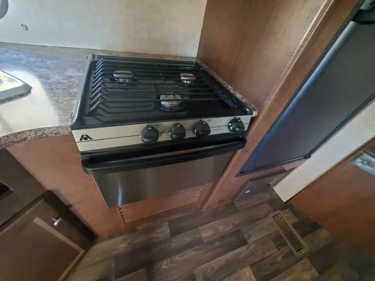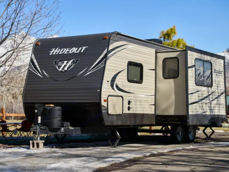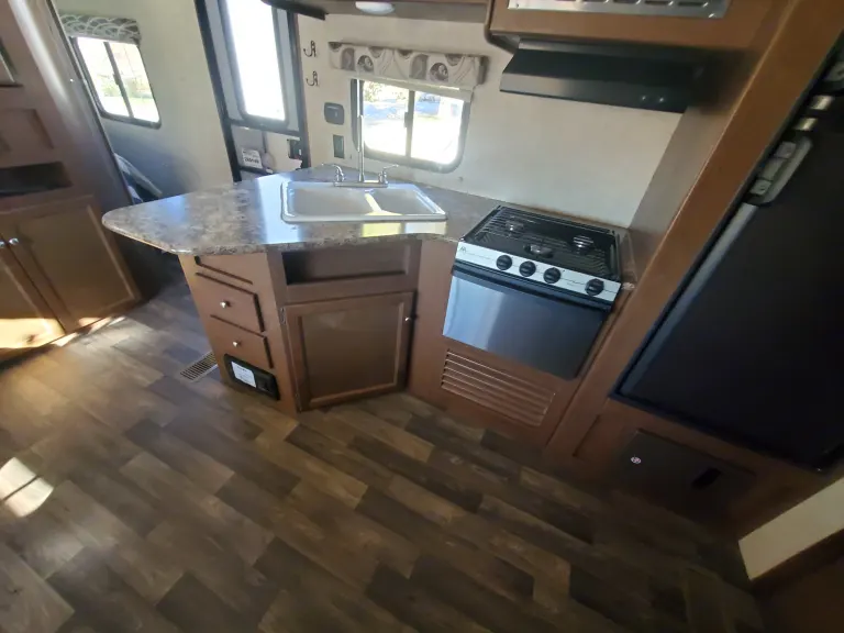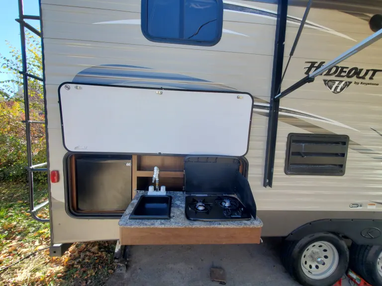 This Hideout is bumper towed with lots of amenities including: indoor and outdoor kitchens, a great entertainment system with indoor and outdoor speakers, indoor and outdoor showers, (The indoor bathroom is large enough to use as a dressing room.) The heater and AC are wonderful and controlled by thermostat. The central vacuum system is perfect for cleaning up after your pet or just keeping the place clean. The awning is durable and spacious to provide all the shade you need. Enjoy games and music inside and out. There is plenty of storage for all your gear.