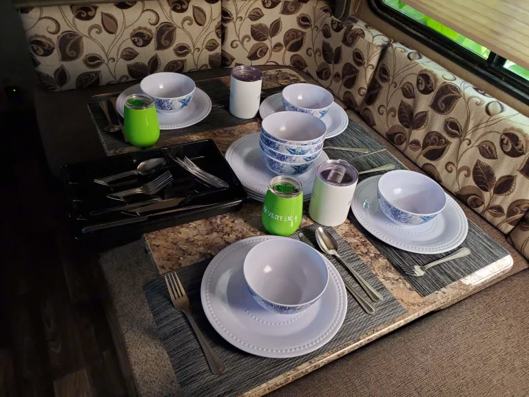 Ce qui est inclusComes with dishes and utensils. Linen for the master queen bed is included. includes 4 camping chairs (2 Adult and 2 kid-size), a folding table, and 2 large artificial turf carpets for outside.