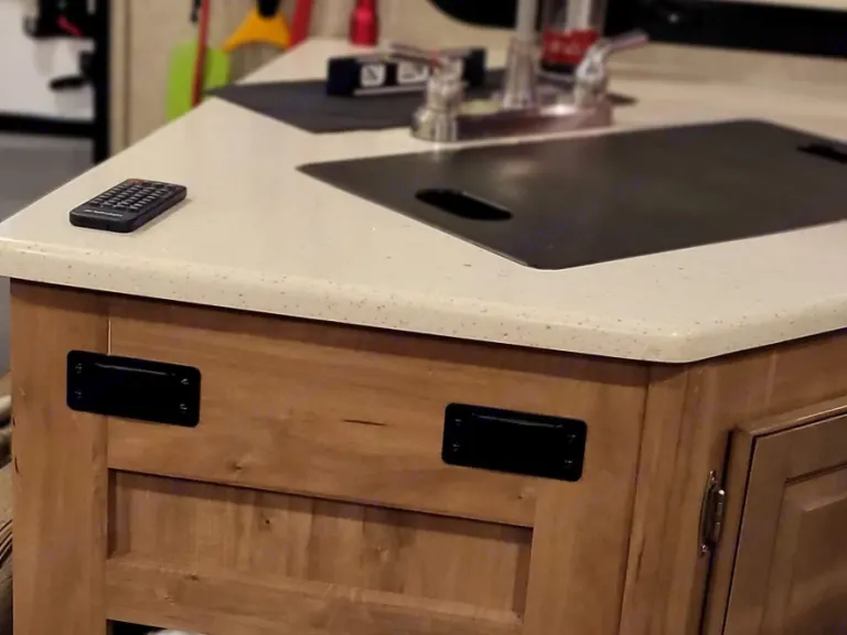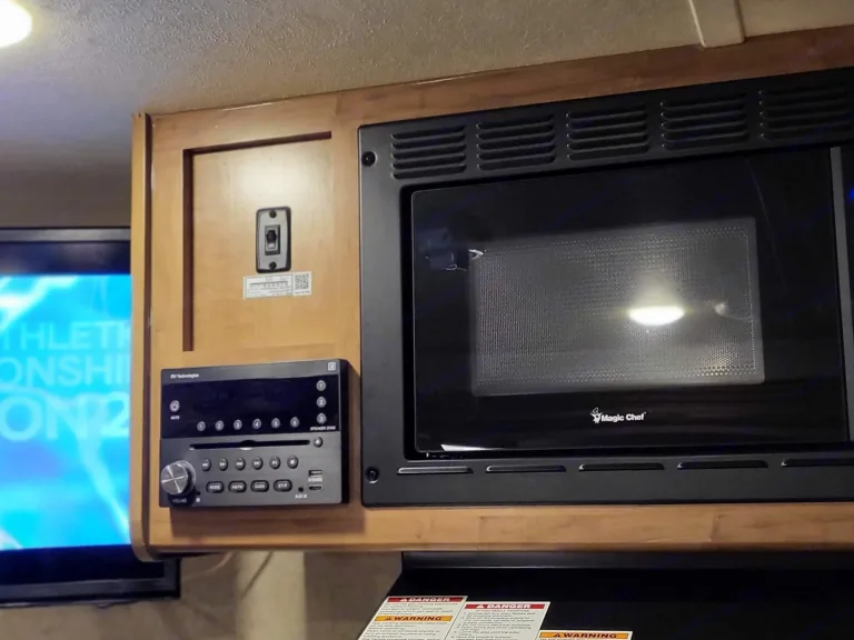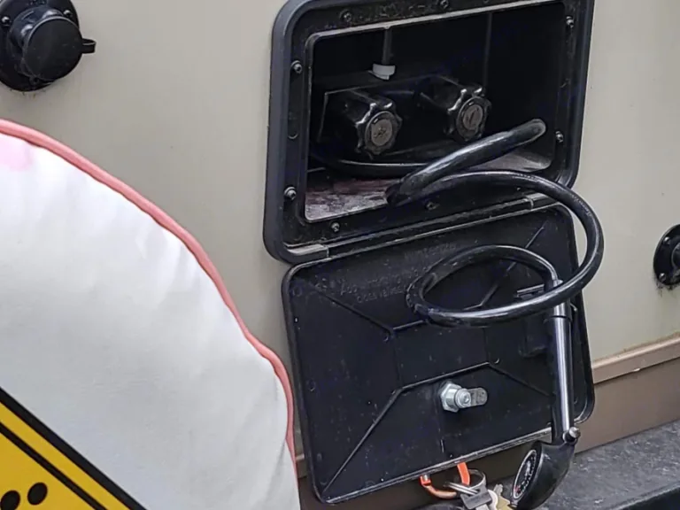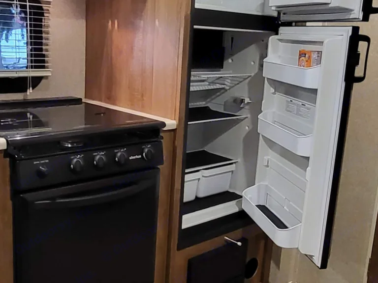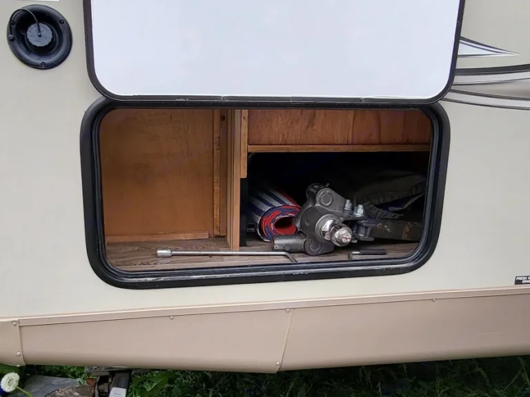 It still smells, & looks brand new, the TV sets up outside of the unit, for movie night.. the outdoor kitchen is what sets us apart, with it's own fridge, sink, cupboard, propane 2 burner stove. Also the rail on the wall is for the BBQ and small shelf, The lighting to the outside is amazing, and for those bad bug nights, hit the orange light and they disappear. Receiver, & stableizer bars included.Ce qui est inclusWe include, bedding and linen.