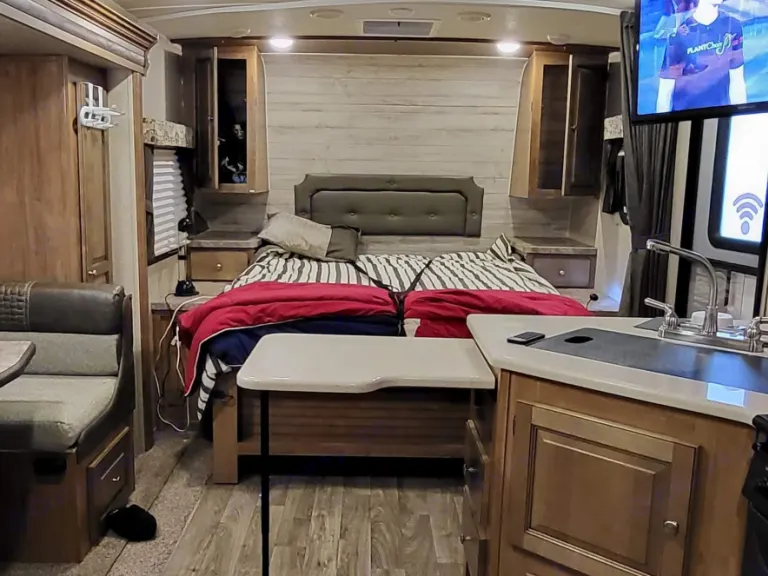 The Lonewolf is set up to be spacious and comfortable during the day, with a queen size heated murphy bed, the folds into the wall, bedding included, leaving a nice leather couch., the other bed is a table bed.