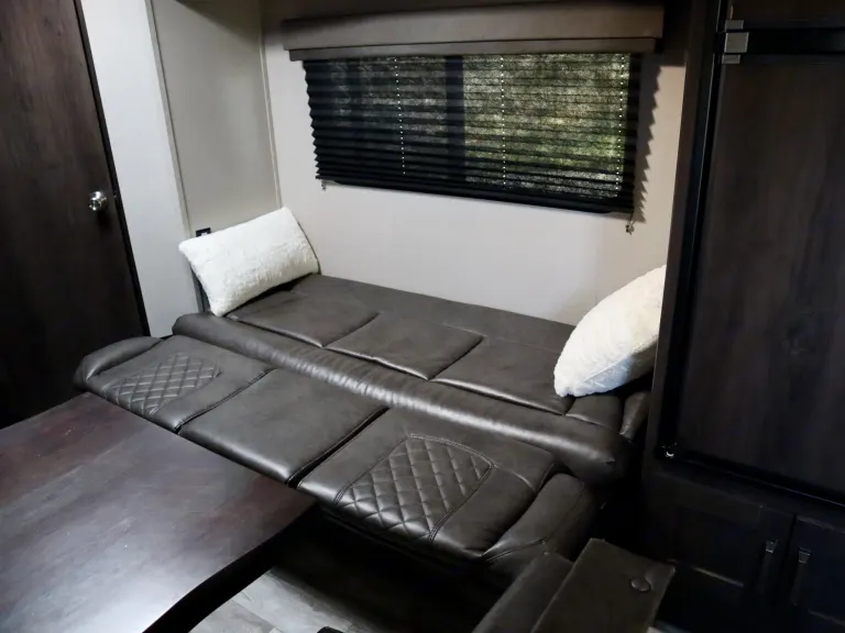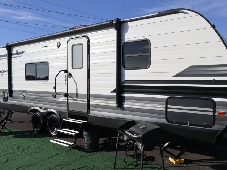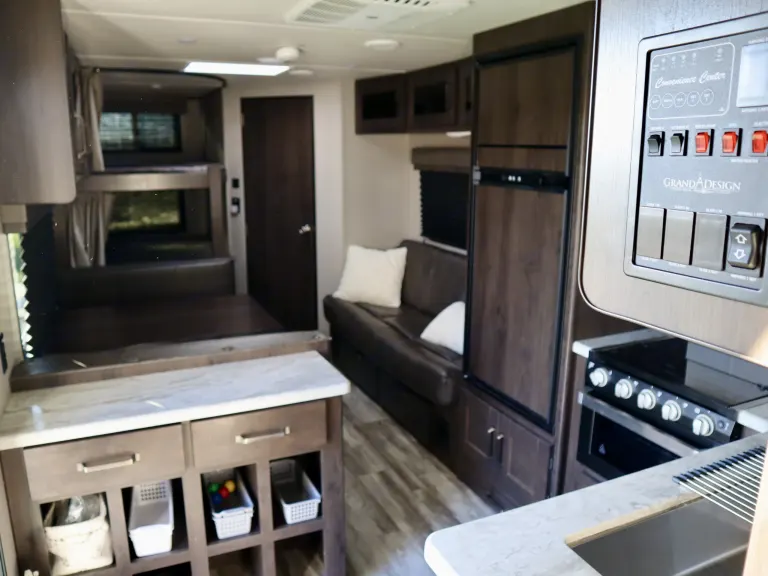 2021 Grand Design Transcend Xplor 247BH – Family Bunkhouse AdventureThis well-equipped travel trailer is perfect for families, couples, or small groups looking to enjoy the outdoors with comfort and convenience. While it can sleep up to eight people, it’s best suited for groups of six or fewer adults for maximum comfort.The private front bedroom features a queen bed with a solid door for added privacy. In the rear, there are two full-size bunk beds that are great for kids or cozy for adults. A convertible dinette and roll-over sofa provide additional sleeping space as needed.The kitchen includes a three-burner stove, oven, microwave, refrigerator, stainless steel sink, and is stocked with cookware, dishes, and utensils. The bathroom features a walk-in shower, toilet, and vanity—roomy enough for daily use without feeling cramped.This trailer is designed for year-round travel with both air conditioning and a furnace, plus an insulated underbelly and heated tanks for cooler conditions. It's also solar-ready and includes generous fresh, grey, and black water tank capacities for dry camping or full-hookup sites.Enjoy the power awning, Bluetooth speakers inside and out, and plenty of USB charging ports throughout the cabin. Camp chairs, an outdoor rug, and all setup gear are included to make your trip easy and enjoyable.Whether you’re heading off-grid or to your favorite campground, this trailer has everything you need for a smooth and memorable trip. Delivery and setup options are available upon request.Ce qui est inclus• Fresh linens, pillows, and towels