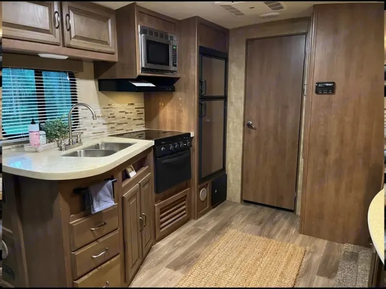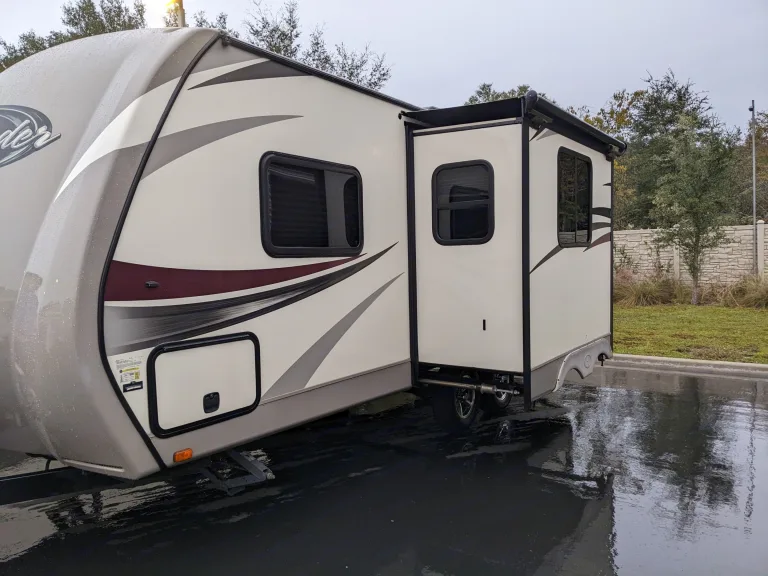 Experience the perfect blend of comfort and adventure with our well-appointed RV. If you're seeking an economical way to travel without sacrificing the comforts of home, our travel trailer is the ideal choice. Despite its compact size, it boasts a spacious and well-designed interior, complete with upscale finishes that enhance your travel experience.Our RV features a fully-equipped kitchen with a double sink that includes a built-in cutting board, a stove, microwave, and oven, ensuring you can cook your favorite meals just like at home. Whether you're braving the summer heat or the chill of winter, our climate-controlled environment with ice-cold air conditioning and toasty heating will keep you comfortable no matter your destination or the time of year. Please note: The air conditioner will only operate when the RV is properly connected to a 30-amp RV electrical hookup.The bathroom is surprisingly roomy for an RV, equipped with a glass double sliding door shower, a large storage cabinet, and additional under-sink storage, making it easy to keep your toiletries organized. You'll also find ample storage throughout the RV, allowing you to bring along all your essential items without feeling cramped.Each rental includes fresh linens, a fully stocked kitchen, and a complimentary check-in basket filled with items like pasta, sauce, and water to start your journey off right. The camper is equipped with a fresh water tank and two full propane tanks for your convenience.For those looking to explore Florida, our RV is perfectly suited for trips to the state's picturesque parks, whether along the coast or near the natural springs. For a more luxurious camping experience, consider Disney's Fort Wilderness—though it may be pricier, it offers a high-class, amenity-rich experience. Please note that smoking and pets are not allowed in the RV to ensure it remains fresh and clean for all users.Enhance your travel experience with our RV's thoughtfully designed bedroom that combines comfort and convenience. The queen-size bed features ample storage underneath and is flanked by shoe organizers on each side, capable of holding up to six pairs of shoes in total. Adjacent to the bed, two wardrobes with hanging storage compartments provide ample space for your clothing and personal items, making organization a breeze.The camper comfortably sleeps 2 in the private bedroom area, and the built-in dining area converts into an additional bed, providing extra sleeping space as needed.Unique among travel trailers, our RV boasts sliding doors that separate the bedroom from the rest of the living space, offering privacy and tranquility. For entertainment, the TV is mounted on a swivel, allowing you to enjoy your favorite shows from either the bedroom or the main dining/living area. Additionally, the bedroom is equipped with reading lamps that offer both white and blue lighting options to suit your mood or need.We've also upgraded the sleeping experience with a super comfortable and plush mattress topper, ensuring a restful sleep. The mattress is encased to ensure cleanliness and peace of mind, eliminating any concerns about contact with previous guests. This combination of features ensures that our RV provides not just a means of travel, but a cozy, luxurious retreat no matter where you are headed.Please Note: The extra pillows in the bedroom photos are not standard. Though the camper is spacious, we have had feedback from guests that it's way too many pillows to deal with in a small space. We include two standard bed pillows with the rental. If you want the additional pillows, let us know at the time of booking and we will include them. The guitar and hats are our personal items and are not included in any rentals.Ce qui est inclusFresh linens are included with every rental. Water and two propane tanks. RecommandationsThere are so many wonderful places to go in Florida, a good place to start would be our state parks. There are so many, along the coast of near the natural springs. There is also Disney's Fort Wilderness, a bit pricey but a high class, amenity rich camping experience. Autres points à signalerSmoking is not allowed in our RV.