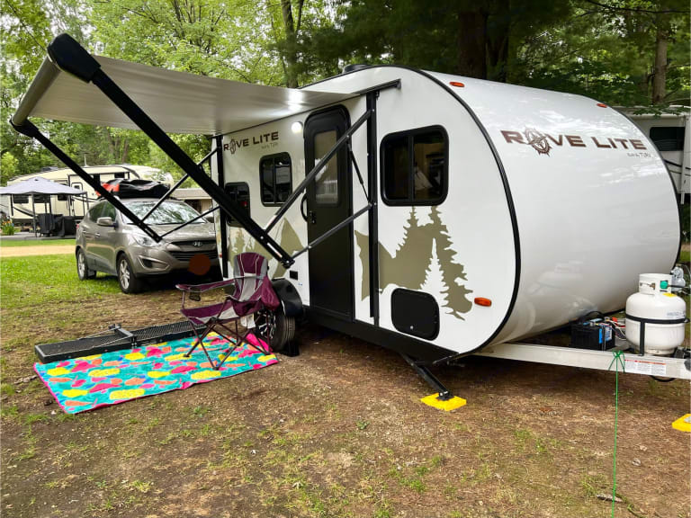 This “Hive” is perfect for a getaway! This smaller trailer provides big amenities like a fridge, sink, gas stove, toilet, and a Shower! There is an additional outdoor shower too! It comes equipped with a traveling pots and pans set, cups, plates, silverware, and mini crockpot. Bunk beds are a great touch for kiddos or using the top bunk for storage (only equipped for 150lbs). So come enjoy a beverage under the awning or snuggle up under the twinkle lights in the trailer. Pets approved upon request.Ce qui est inclusMini crockpot, outdoor propane camping stove, pots & pans, bed linens and pillows.Autres points à signalerPets welcome with approval.