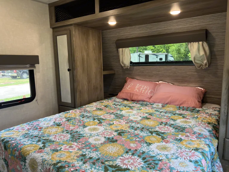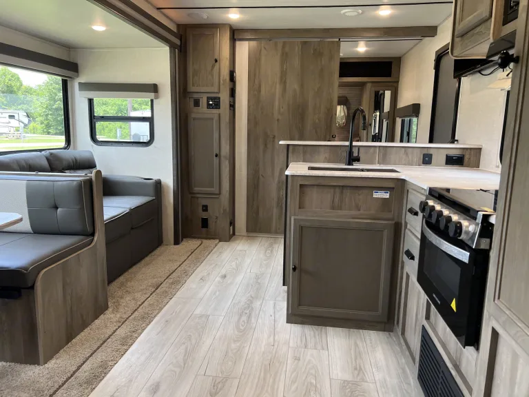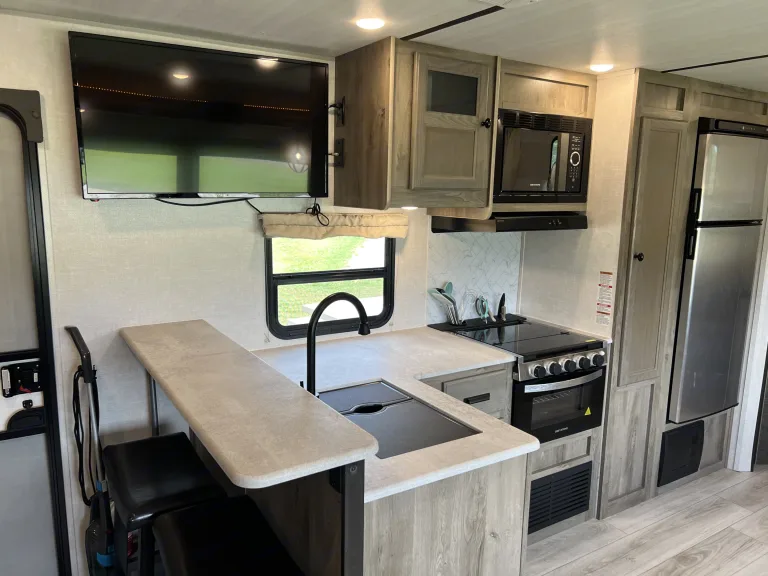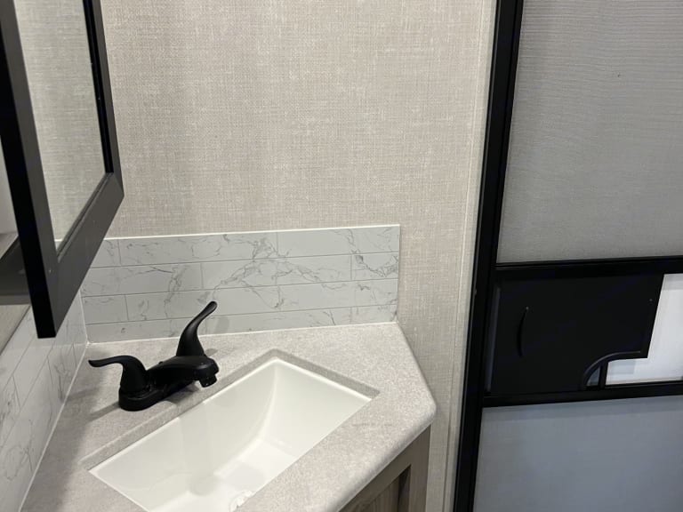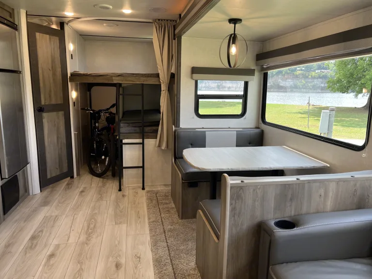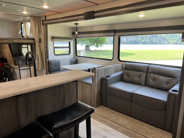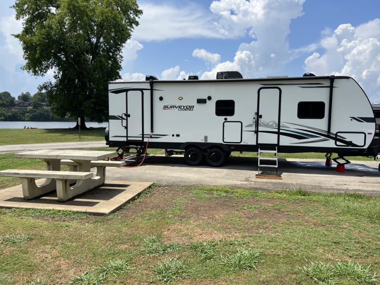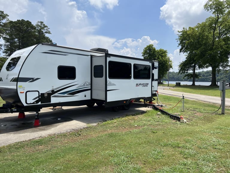 This dual entry travel trailer is the ultimate getaway for your weekend trips to the lake. Within the large slide out you'll find a booth dinette and tri-fold sofa for seating and sleeping space, plus there is a breakfast bar with stools the little ones are sure to love. Check out the beautiful barn door that leads to the front bedroom where you'll find a queen-size memory foam bed and dual wardrobes.The audio system has 2 zones, so you can connect to bluetooth and listen indoors, outdoors, or both. There's also an outdoor mini fridge, prep station and water sprayer under the 19' canopy. The large slide has larger windows for better views.Note: We only deliver, No boon docking or dry camping.Ce qui est inclus4x Camp chairs, propane grill and griddle, linens/towels, cookware, utensils, toilet paper. Delivery and pick-up only, please inquire for delivery locations throughout North Alabama.RecommandationsThere are many great options for full hook-up camp sites in North Alabama. We just spent 3 weeks on the river at Mcfarland Campground in Florence, AL and the kids loved it.Autres points à signalerNo pets, no festivals or tailgating, no smoking.