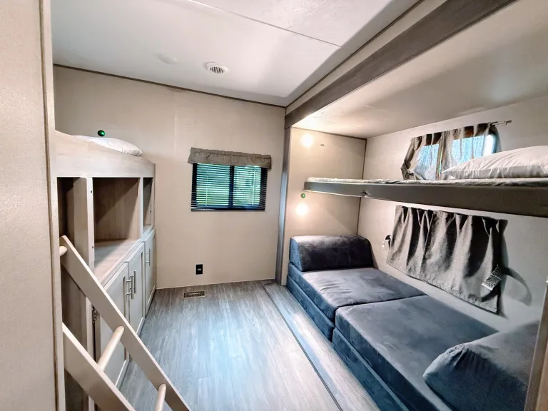 Enjoy a true home-away-from-home experience in this 2023 Forest River Aurora 340Bhts Sky Series — a luxurious, family-friendly travel trailer perfect for your next adventure. With three slide-outs, a separate bunkhouse, and sleeping for up to 10, this unit is ideal for large families, multi-family vacations, or extended stays.The private master bedroom features a walk-around queen bed, wardrobe storage, and overhead cabinets. At the opposite end, the rear bunkhouse offers two bunks, a fold-down sofa sleeper, storage, and its own entertainment space — a dream for kids or guests!The main living area includes a spacious U-dinette, sofa, fireplace, and a full entertainment center. The kitchen is fully equipped with a large fridge, microwave, 3-burner cooktop, oven, and tons of cabinet space. And when it's time to take the fun outdoors, the outdoor kitchen with a griddle and mini-fridge keeps you cooking under the stars.