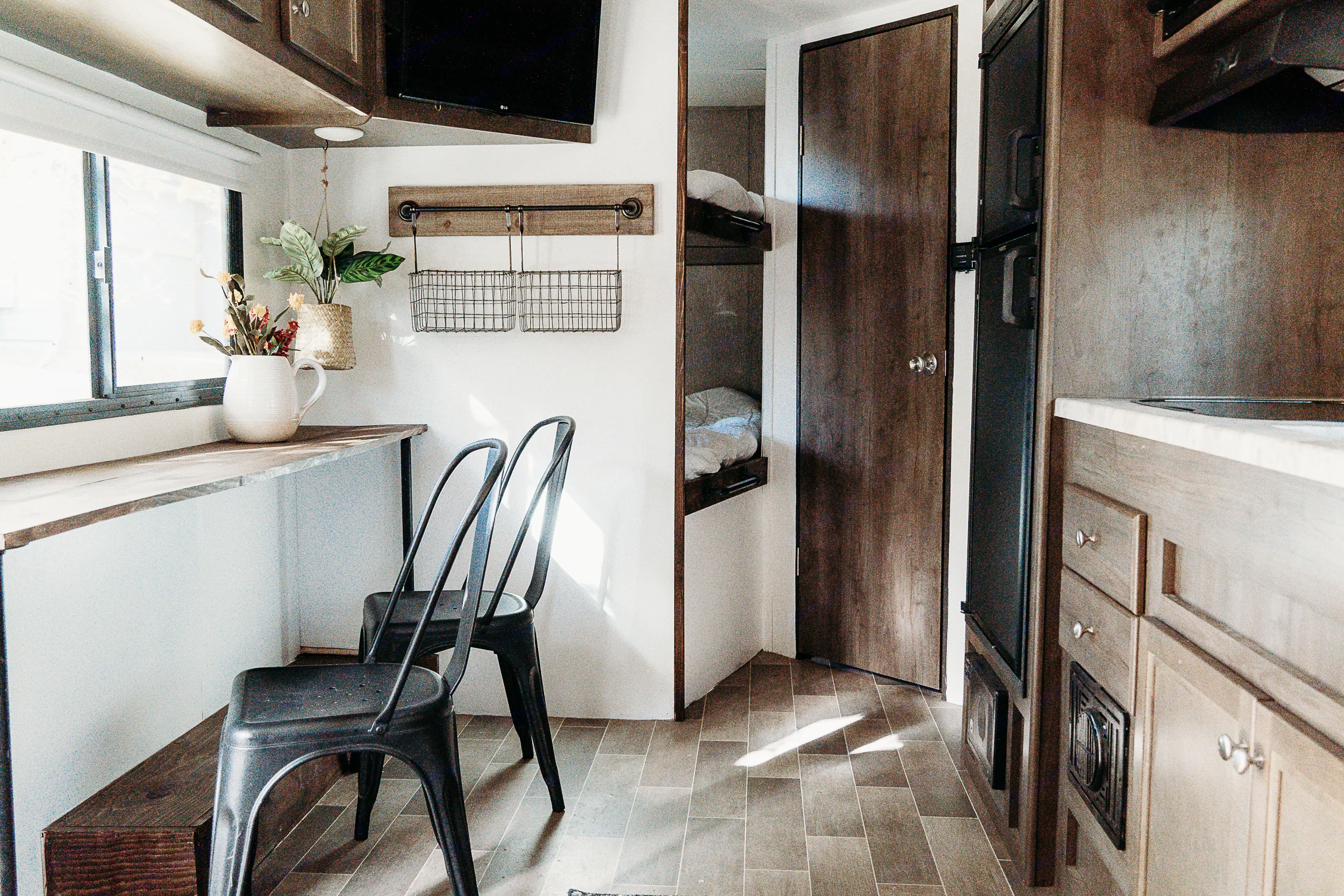 Our camper accommodates sleeping arrangements for up to 4* people. (see note below) Murphy couch transforms into a comfortable queen-sized bed, complete with storage compartments for your personal belongings. The rear bunk beds are perfect for kids or additional guests, ensuring everyone has their own cozy space to rest after a day of adventure. Lightly remodeled, modern vibe. Removed dinette and added table ledge for additional room in camper.This travel trailer is equipped with all the necessary utilities, including air conditioning and heating, to keep you comfortable in any weather. It also has a reliable electric and water hookup system to ensure a hassle-free camping experience.Enjoy the outdoor refrigerator for additional cold storage (only works with electric hook up)*Sleeps 4 adults comfortably. (2 in queen bed, 1 person in each bunk) You could fit two children in each bunk as an option) Ce qui est inclusFresh Linens