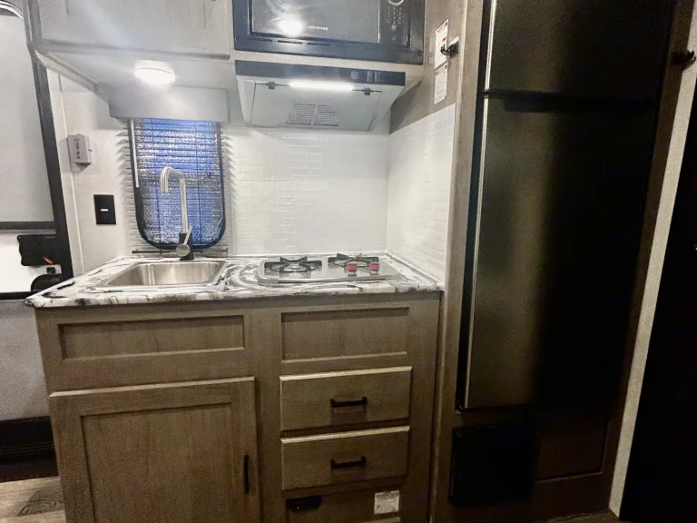 Gilligan's Island "Mary Ann" is a 2021 Keystone Hideout with 1 slide, 17.6 ft. Lightweight easy to tow. Nicely set up for you with all the extra necessary items, coffee maker, toaster, crockpot, cookware, linens, 6 bath towels/4 hand towels/6 wash clothes, 4 camp chairs, trash containers, cleaning supplies provided. Portable Bluetooth FM/Speaker unit. Good size refrigerator/freezer, 2 propane burner cooktop, microwave, Smart TV with Roku, USB ports, Keyless Entry, Exterior LED lights, plenty of storage underneath the queen bed & pass through. Shower, bath sink & commode. Easily can sleep 5-6 comfortably. 1 Queen bed, 2 Twin bunks + Dining table conversion/sleep area. All you need is your clothes, food, beverages & destination. Mary Ann is a super cute unit with some extra interior space with the slide.~As Additional ADD ON Options: