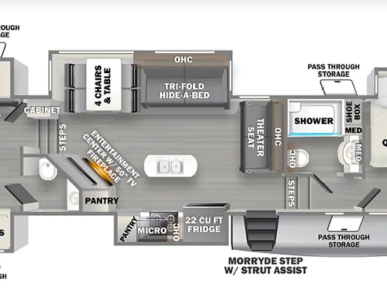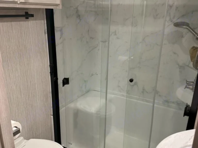 There is a fully enclosed, heated underbelly and an unobstructed drop-frame pass-through storage area with cable jacks and 110V outlet. Two LED-lit exterior speakers add some fun to the outside, and the docking station includes easy winterization, hot and cold spray port, black tank flush, and pull valves for tanks. But the true luxury is found inside with the 84" interior height, residential countertops, recessed residential lighting, extra-large picture windows, LED-lit headboard, and premium sound bar with built-in flush-mount DVD player. This unit has also been prepped for a washer/dryer so that you can extend every trip and feel more like home.