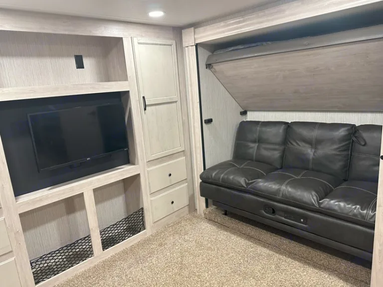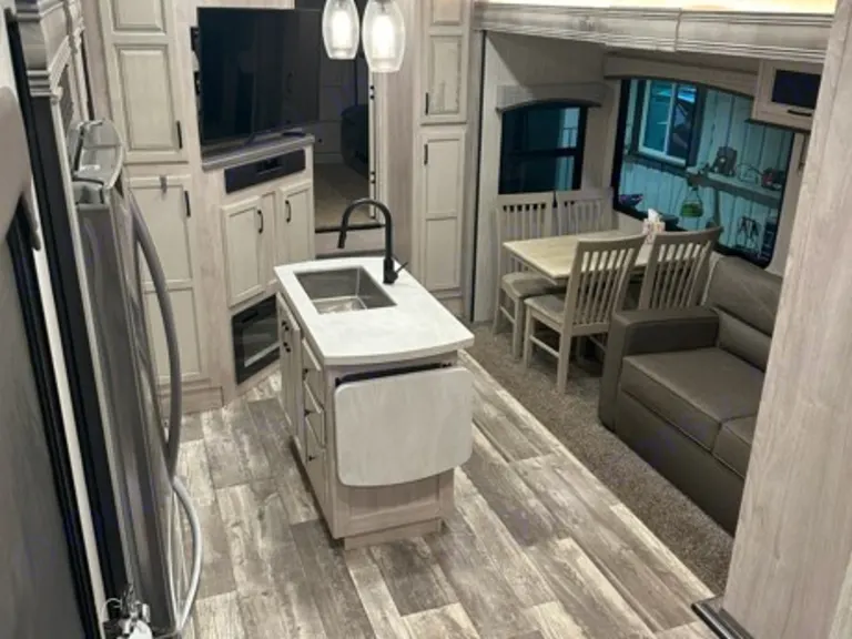 I Will Deliver Anywhere!This Sandpiper Luxury fifth wheel has everything you will need for a comfortable camping trip! Your kiddos or guests will have their own privacy with the rear private bunkhouse that has a flip bunk above a glide sofa slide, a set of 32" x 74" bunk beds, an entertainment center with wardrobes on either side, and even a half bathroom. There are two pantries to store everyone's snacks, a residential refrigerator to keep your perishables fresh, a four burner cooktop to fry up some eggs, and a kitchen island with a double sink for easy clean up. The tri-fold hide-a-bed sofa and theater seating offer comfortable places to sit while you enjoy the fireplace and 50" flat screen LED Hdtv at the entertainment center. The front private bedroom has a queen bed slide for you to lay your head at night, a shoe box to keep your shoes out of the way, a dresser, and a front wardrobe to hang your clothes!