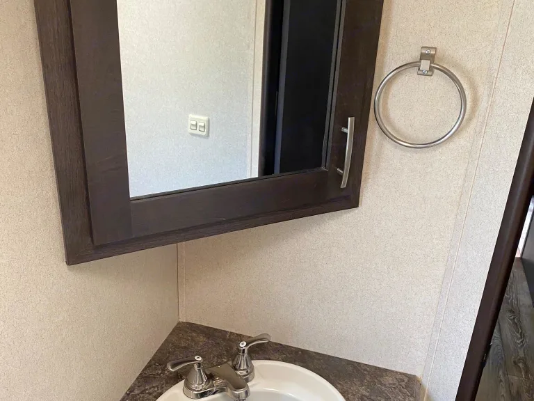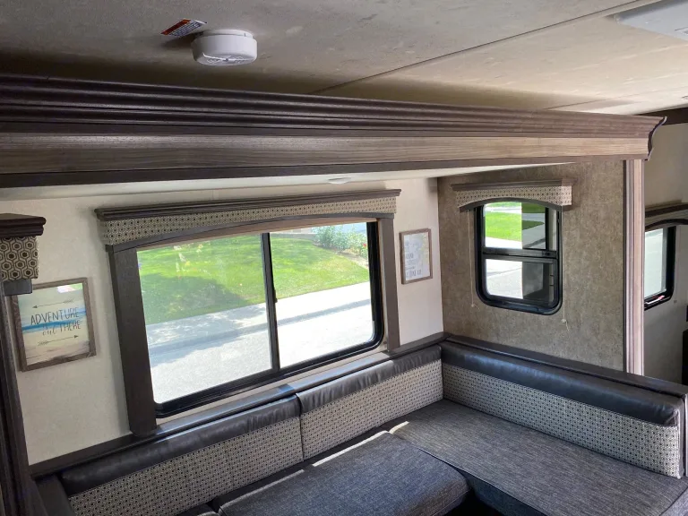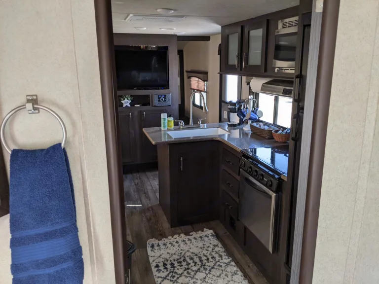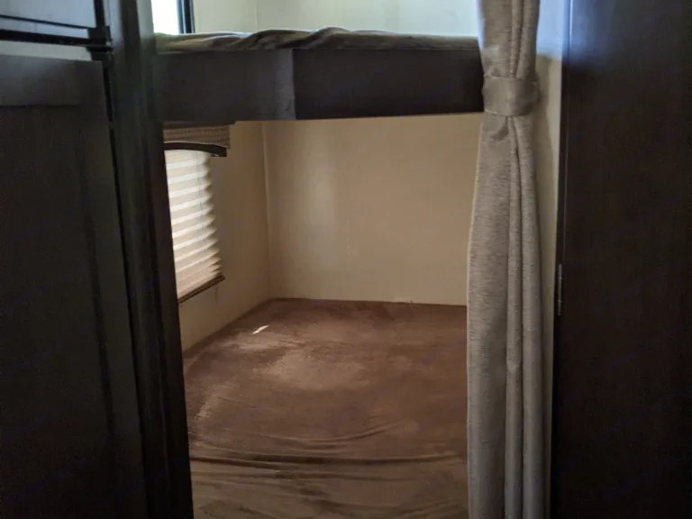 All the comfort of home. AC for hot days and furnace for cold nights. Warm earth tone interior with LVS floor throughout for worry-free easy cleanup. 2 Bunkbeds big enough for adults. Private walk-around queen bed up front for mom/dad. Large rear bathroom with its own exterior entry for convenient access. Large shower just like home! Lots of closet space throughout. 3' deep U shape dinette that will convert to a full-size bed if needed. Interior/Exterior stereo system. DVD and 1- 42" TV in the main living area. . 6000lb for an easy pull behind any 1/2 ton truck or SUV. Weight distribution hitch to make for a nice stable ride to your adventure destination of choice. Ce qui est inclusBasic pots/pans/dishes/flatware all included. Bring your own linens or sleeping bags. Camping chairs x 4 and 4' folding table included.