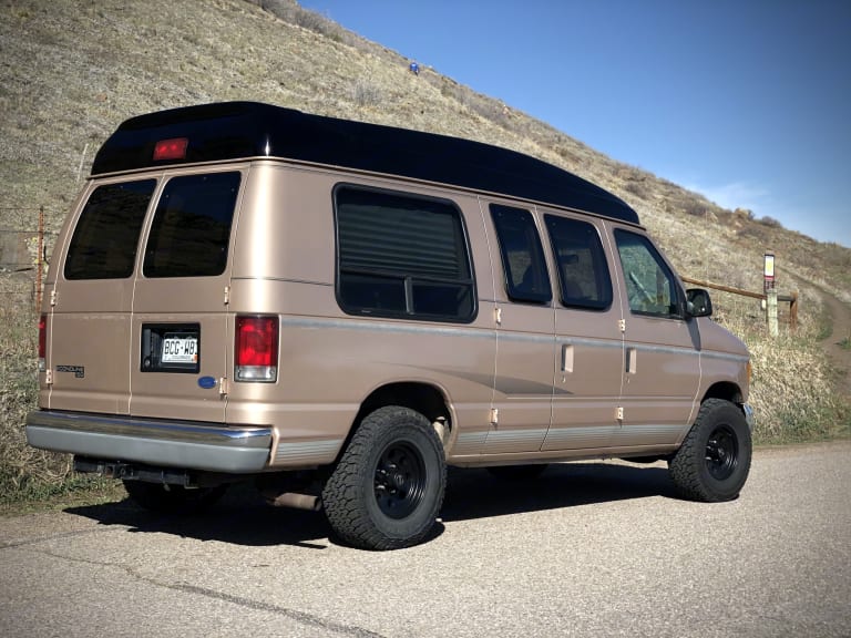 Meet Jolene. A mechanically sound 1997 Ford e-150 conversion van with 32” all-terrain tires and a 2.5” lift.Additional head height throughout provides a near-standing interior.