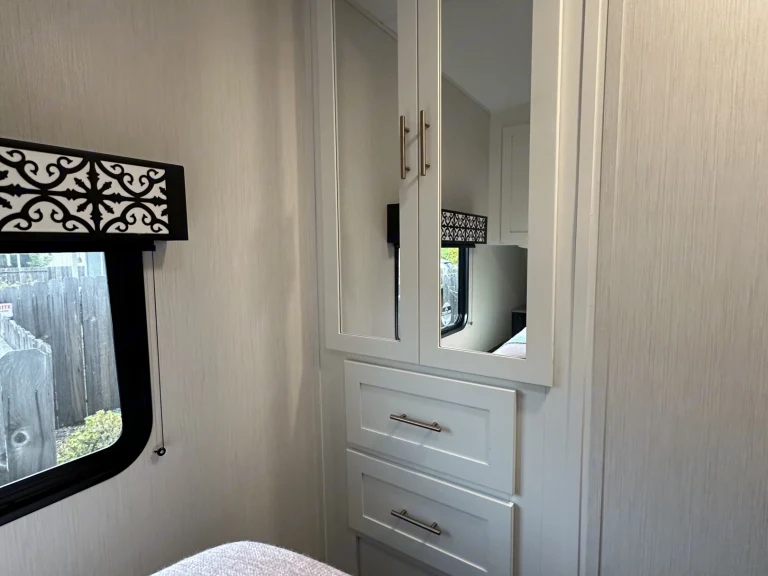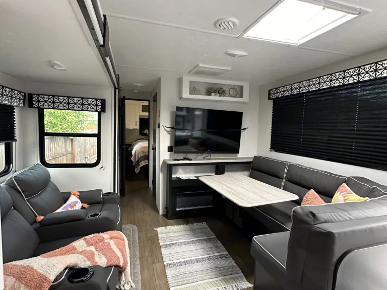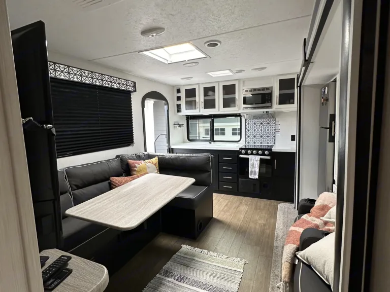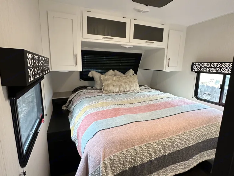 • Experience luxury on wheels in this cozy travel trailer, ideal for couples.