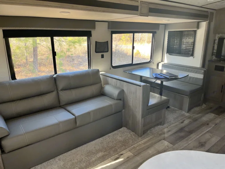 Making memories and spending time with friends and family out doors is what we want to be a part of. Ce qui est inclusBasic necessities ( fresh linens, cookware and utensils)RecommandationsThis travel trailer is jam packed with high end components. Lots of storage. Bring you own chairs for outdoor use and bathroom necessities. I supply 1 roll rv toilet paper and paper towels. Autres points à signalerI prefer not to let table down for beds. 1 small dog is allowed. If I deliver and pickup I’ll charge a fee