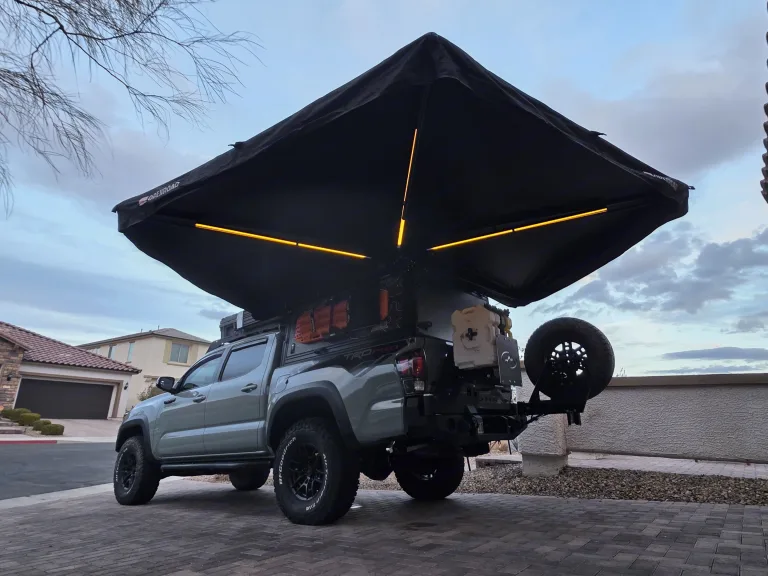 This Toyota Tundra has been outfitted with a Pack Out Hardshell camper with a pop up roof top tent This tent can be setup in less than 1 minute with breakdown equally as fast. The sleeping platform is 92 inches (8.5 ft length) and 49 inches wide, accessible inside the camper. No need for outside ladders to climb up or down. Tent can fit 2 adults (2 adults + 1 child). Use the bed of the truck for more sleeping room for more company. The RTT - roof top tent has 3 windows, is waterproof and vented. Clean blankets and pillows provided.*Just Added* 270 Awning with camp lights!