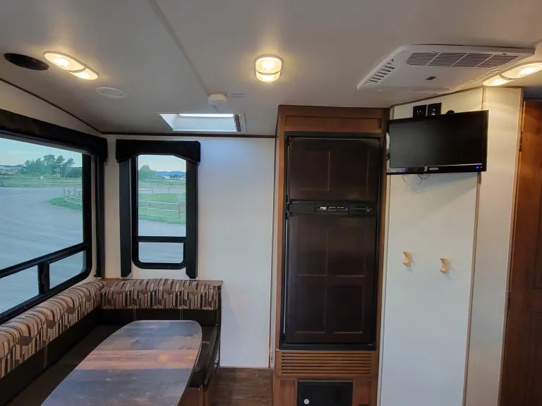 Bring exceptional comfort and functionality to your next adventure in this 4 season Outdoors RV. With a pillow top queen bed and included extras, this camper will provide the perfect home base for your Rocky mountain adventure.This trailer has ample storage for all you toys and room to easily sleep 3. If you have younger kids, we offer a set of bunk cots that can be set up in the dinette area adding room to sleep 2 kiddos while the adults retire to the queen bed.With 200AH batteries, you should have plenty of battery to use all the features for a weekend, but we can include a generator or solar panel to keep the batteries topped off at no additional charge.Full kitchen inside includes an oven, 3 burner stove, and microwave! Dual sink, extra counter space, and a hot water heater make meal prep and clean up a breeze too.As the temperatures start dropping, you'll rest easy knowing you're sleeping in a 4 season camper with extra insulation, dual pane windows, and a robust heater!Ce qui est inclus• Nonstick cookware makes cooking a breeze.