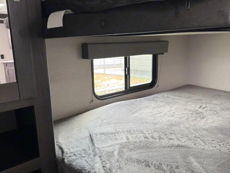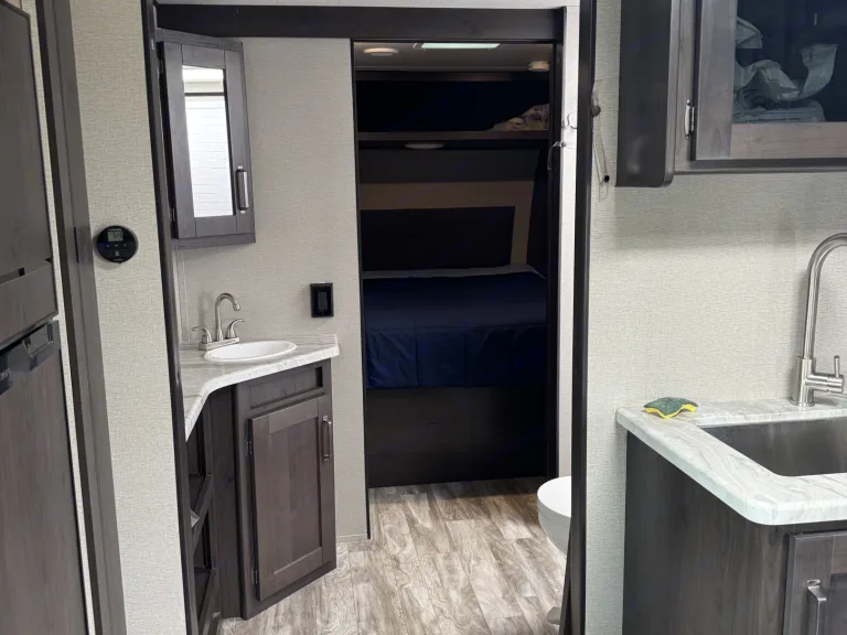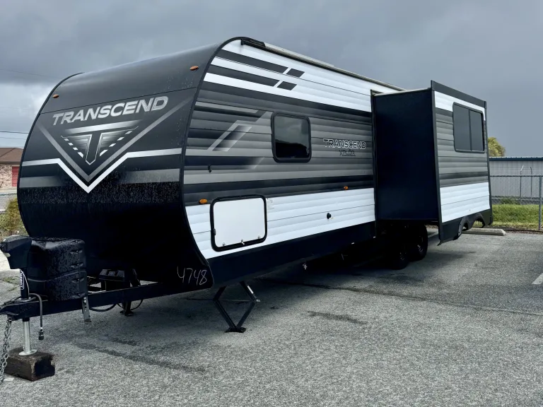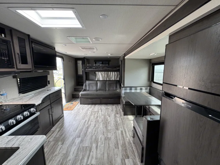 The 2022 Grand Design Transcend Xplor 265BH is a bunkhouse travel trailer designed for families, featuring a queen bed in the master, two full-sized bunks, a sofa that converts into a bed, and a u-shaped dinette that also converts to a bed.
