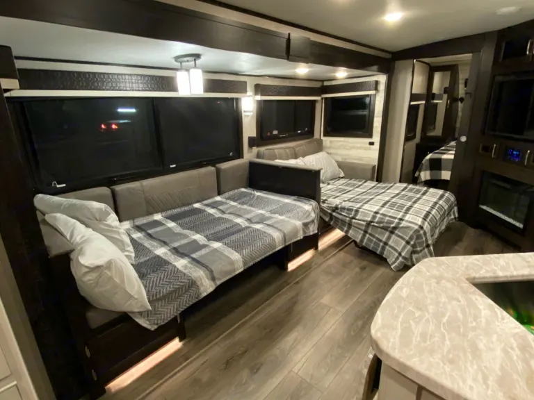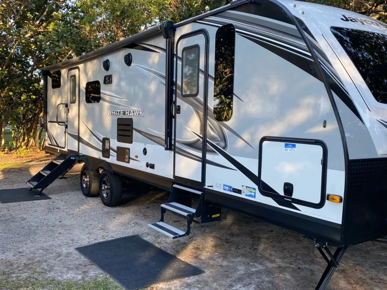 Make memories with our cozy brand new 2021 White Hawk. Super clean and sanitized after every use. Sleeps comfortably 8 with a private queen room, sofa bed, double bed bunks, and dinette. One slide out in the living area to provide more space. Spacious bathroom with towels (at no additional cost) Fully equipped kitchen with stove, oven, microwave, refrigerator. We also provide plates, cups, utensils pots & pans, coffee machine, dish soap, trash bags, paper towels and other basic needs to ensure you have a great experience. 2 cold A/C units and heating system. 2 Flat screen TV's. Outdoor kitchen with refrigerator, sink and grill. Awning with LED lights and radio.We are flexible with check in and check out time. Please let us know how we can accommodate.Generator is available upon request and at an additional price.For renters hitching & taking OR dry camping: Customer is responsible for dumping black and grey water. If it is returned full, there will be a $100 charge deducted from the security deposit. (This does not pertain to campgrounds with full hook up)NO Smoking is permitted inside the RV. If there is evidence of smoking there will be a $200 fee deducted from the security deposit.Ce qui est inclusLinens, towels, and kitchen utensils.RecommandationsGreat location for the keys and/or Everglades.Autres points à signalerPETS WELCOME! Additional charges may apply for: generator, black tank flush and cleaning.
