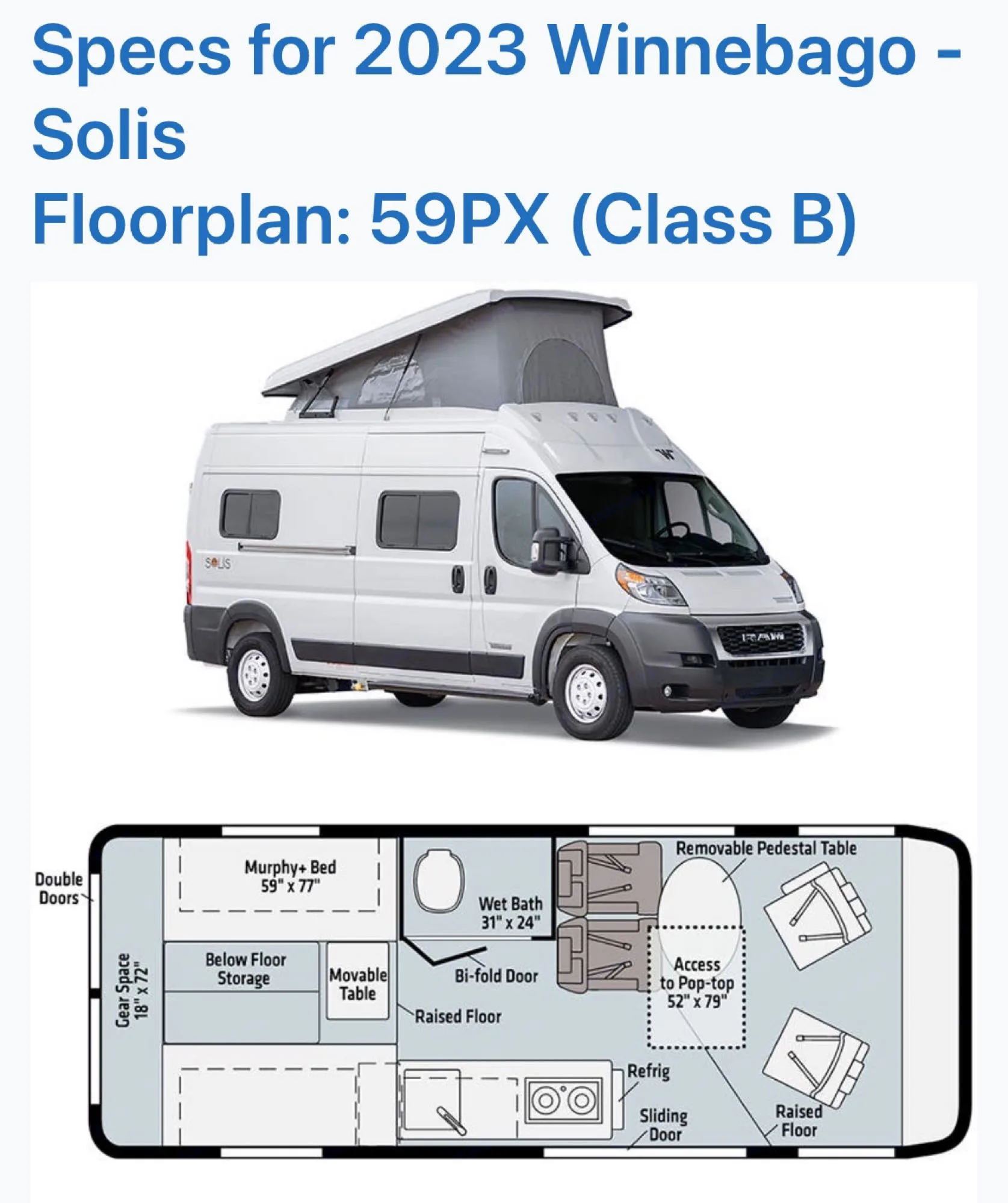 6. **Outdoor Living Space**: Extend your living area outdoors with the manual Thule awning and exterior wash station, perfect for rinsing off after a day of hiking or biking.Whether you're planning a weekend getaway to the mountains, a beachside retreat, or a cross-country road trip, the 2023 Winnebago Solis 59PX is your ultimate companion for outdoor adventure. Book now and start making memories that will last a lifetime!Ce qui est inclusFurnished with cookware, utensils, some kitchenware and bedding. You bring your pillows and personal hygiene products.Some upgrades include