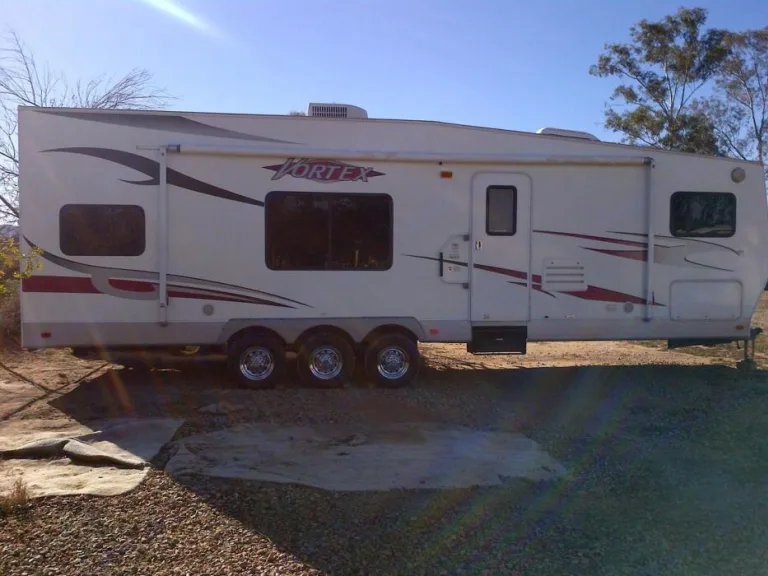 Superior Towing Stability: Triple Axle design provides smooth and secure towing for a stress-free travel experience.Elegant Interior: Featuring beautiful wood cabinets, a double door refrigerator/freezer, microwave, 3-burner stove with oven, and a double stainless steel sink for a high-end cooking experience.Private Bath Amenities: Enjoy the comfort of a private toilet, shower/bathtub, and skylight, making it your home away from home.Entertainment System: Equipped with an AM/FM/CD player, interior and exterior speakers, TV, and DVD player for your entertainment needs.Climate Comfort: Ducted AC and heating system to keep you comfortable in any weather.Versatile Sleeping Arrangements: Dual power queen beds, sofa, and dinette benches that convert into additional beds.Ample Storage and Convenience: fuel station, exterior shower, full walk-on roof with ladder, stabilizer jacks, awning, and extensive cargo space.
