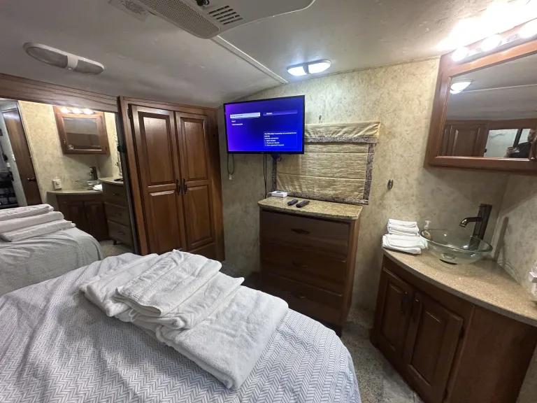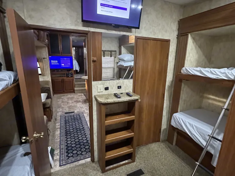 2010 Keystone RV Montana High Country – Spacious Fifth-Wheel for FamiliesEmbark on your next adventure with the 2010 Keystone RV Montana High Country, a 36-foot fifth-wheel designed for comfort and convenience. Perfect for families or groups, this unit sleeps up to 10 guests and is equipped with modern amenities to ensure a memorable stay.Key Features:Master Suite: Queen bed in the front master suite for a restful night's sleepLiving Area: Mid-living space with a dinette conversion bed and jackknife sofa airbed for additional sleeping arrangementsBunk Room: Rear bunk room with two full-size bunks and its own half bath, ideal for kids or extra guestsClimate Control: Three air conditioning units for year-round comfortSolar Power: Onboard solar panels and a 12-volt refrigerator reduce reliance on external powerStorage: Front pass-through hatch provides ample space for gear and belongingsTurnkey Package Includes:Full cleaning and sanitization before every rentalKitchen essentials: pots, pans, cutting board, utensils (knives, can opener, bottle opener, spatula, etc.), coffee maker with K-cups, paper plates, bowls, and plasticwareTank treatment for sanitationAdditional Items (Available Upon Request or as Add-Ons):Fresh bedding for all sleeping accommodationsBath towels, face towels, and hand towels for kitchen and bathroomOutdoor table and chairsBBQ grillOptional generatorStarlink Internet App Service Plans: Unlimited or 50 GB (charged per GB after 50 GB)Booking Details:Minimum Stay: 3 nights (1–2 night bookings available with a 3-night charge)Delivery Only: This unit is for Delivery Only with Full Service SetupService Area: Available for delivery from Indio, including Ocotillo Wells, Borrego Springs, Coachella Valley, Big Bear, Idyllwild, and more. Special Note: This unit is not available for delivery to Glamis.Ce qui est inclusYour rental includes full cleaning, toilet paper, paper towels, trash bags, dish sponge, soaps, paper plates/bowls, utensils, cookware, cutting board, kitchen tools, Keurig with K-cups, and tank treatment. Additional items available: bedding, bath/face/hand towels, outdoor furniture, BBQ, generator, and Starlink Internet (Unlimited or 50 GB, billed per GB over 50).RecommandationsWe recommend checking out one of the valleys best kept secrets for RV resort camping, the Silent Valley Club. Ask us about a free four night stay with free delivery with a fortnight stay or more.Autres points à signalerWe offer a multitude of tern key additional necessities upon request including Internet towels bedding barbecues tables chairs etcetera