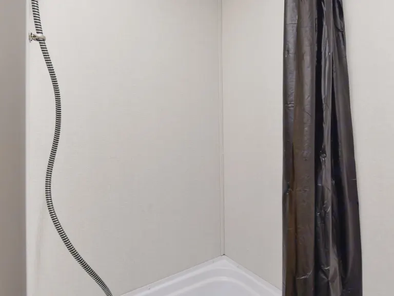 Private rear bathroom featuring a shower with curtain, toilet (plastic foot-flush), and vent fan