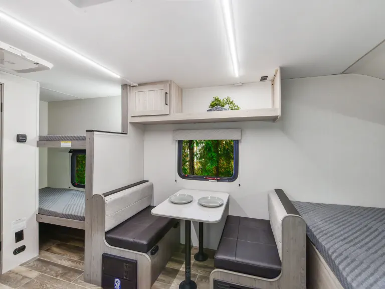 Vinyl flooring and bench‑style dinette adjacent to the kitchen and bunkBathroom & Comfort
