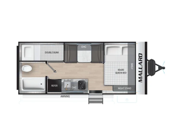 *Queen bed at the front (60″ × 80″) with underbed storage