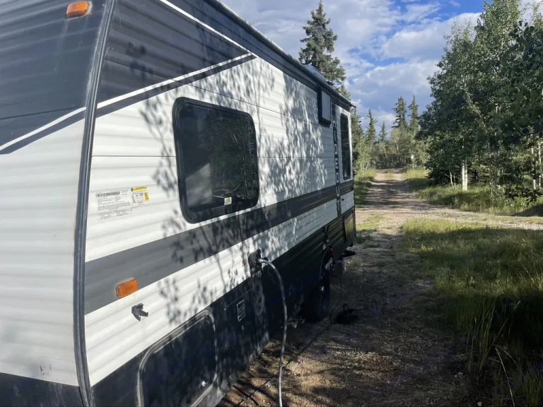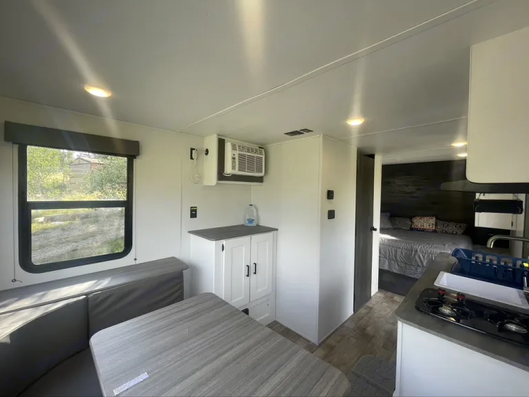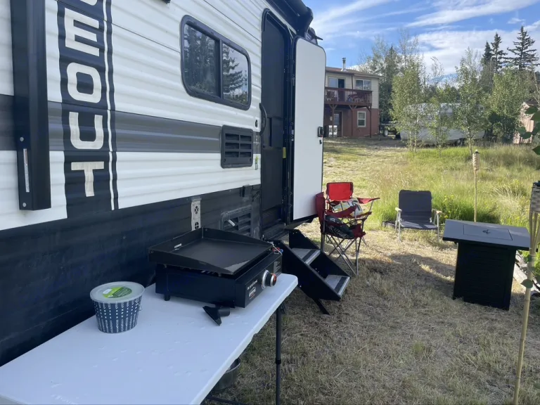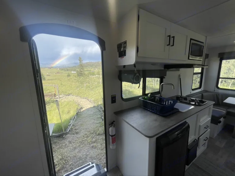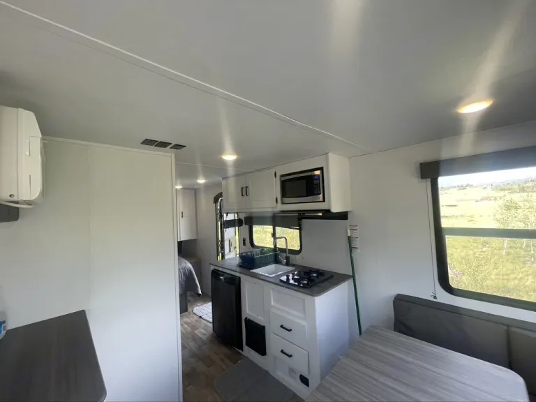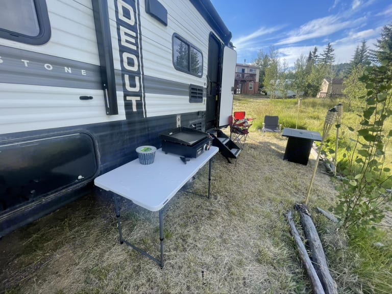 2021 Keystone Hideout 177RD for rentSingle axel camper trailer with Queen Size bed and U-shape dinette convertible to full sized second bed. Comes with microwave, kitchen sink, 2-eye propane burner, refrigerator, electric AC, propane water heater and furnace, and full bathroom with commode, sink, and shower.I have pulled this camper all over Colorado and the West Coast mountains with a 2021 Toyota Tacoma TRD Sport 4x4 6cyl and it was more than doable, but a full size truck or larger would be preferred for comfort. Truck will need to be equipped with 7 pin trailer connection and trailer brake controllerCe qui est inclus4 plastic plates, 4 plastic bowls, forks, butter knives, spoons